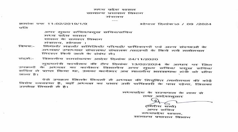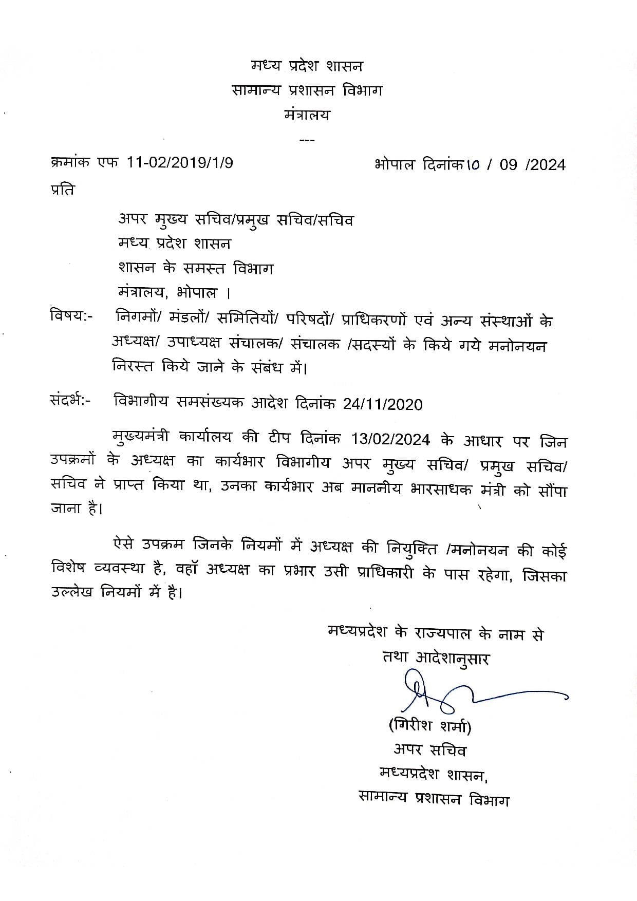 सामान्य प्रशासन विभाग ने आज आदेश जारी कर निगम , मंडलों , समितियों , परिषदों , प्राधिकरणों एवं अन्य संस्थाओं के अध्यक्ष , उपाध्यक्ष , संचालक , सदस्यों के पूर्व में किए गए मनोनयन को निरस्त कर दिया है। आदेश में यह भी कहा गया है कि जिन उपक्रमों के अध्यक्ष का कार्यभार विभागीय अपर मुख्य सचिव , प्रमुख सचिव या सचिव ने प्राप्त किया था , उनके कार्यभार अब भारसाधक मंत्री को सौंपा जाना है। सामान्य प्रशासन विभाग के आदेश में कहा गया है कि ऐसे उपक्रम जिनके नियमों में अध्यक्ष की नियुक्ति या मनोनयन की कोई विशेष व्यवस्था है , वहाँ अध्यक्ष का प्रभार उसी प्राधिकारी के पास रहेगा , जिसका उल्लेख नियमों में है।