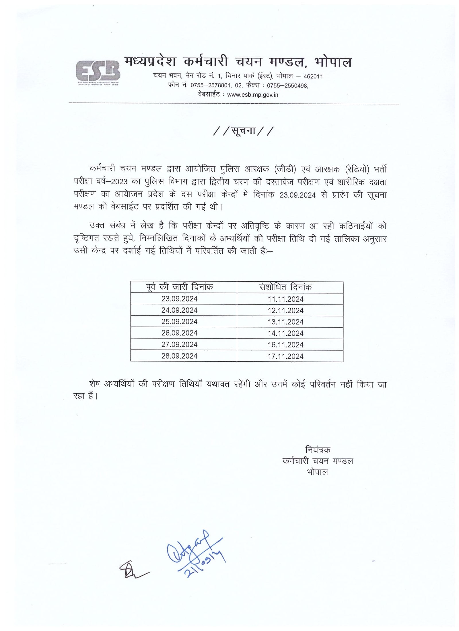 शेष अभ्यर्थियों की परीक्षण तिथियाँ यथावत रहेंगी और उनमें कोई परिवर्तन नहीं किया जा रहा हैं। संबंधित अभ्यर्थी अपना संशोधित दिनांक का प्रवेश-पत्र म.प्र. कर्मचारी चयन मण्डल (ESB) की वेबसाईट से डाउनलोड कर, निर्धारित दिनांक को परीक्षण में शामिल हो।