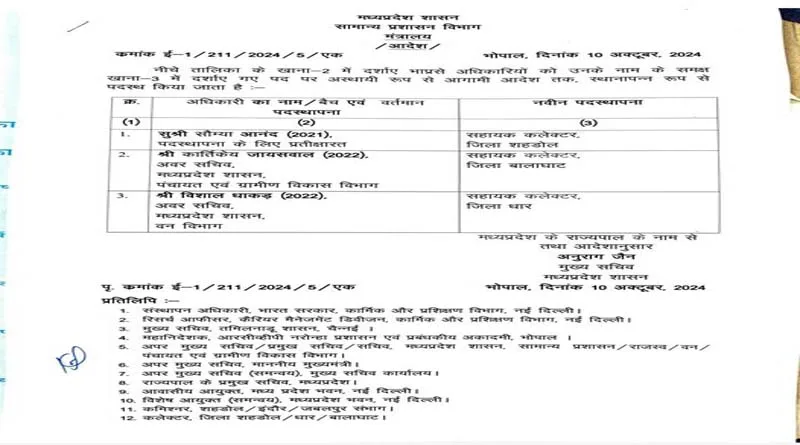 Bhopal भारतीय प्रशासनिक सेवा के अधिकारियों की नवीन पदस्थापना के आदेश जारी October 14, 2024 scnnewsindia.com Scn News Indiaब्यूरो रिपोर्ट सामान्य प्रशासन विभाग द्वारा भारतीय प्रशासनिक सेवा के अधिकारियों की नवीन पदस्थापना के आदेश जारी किये है ।
