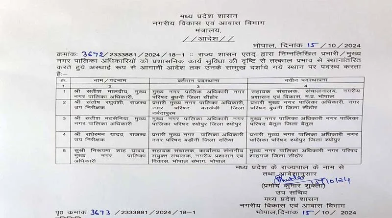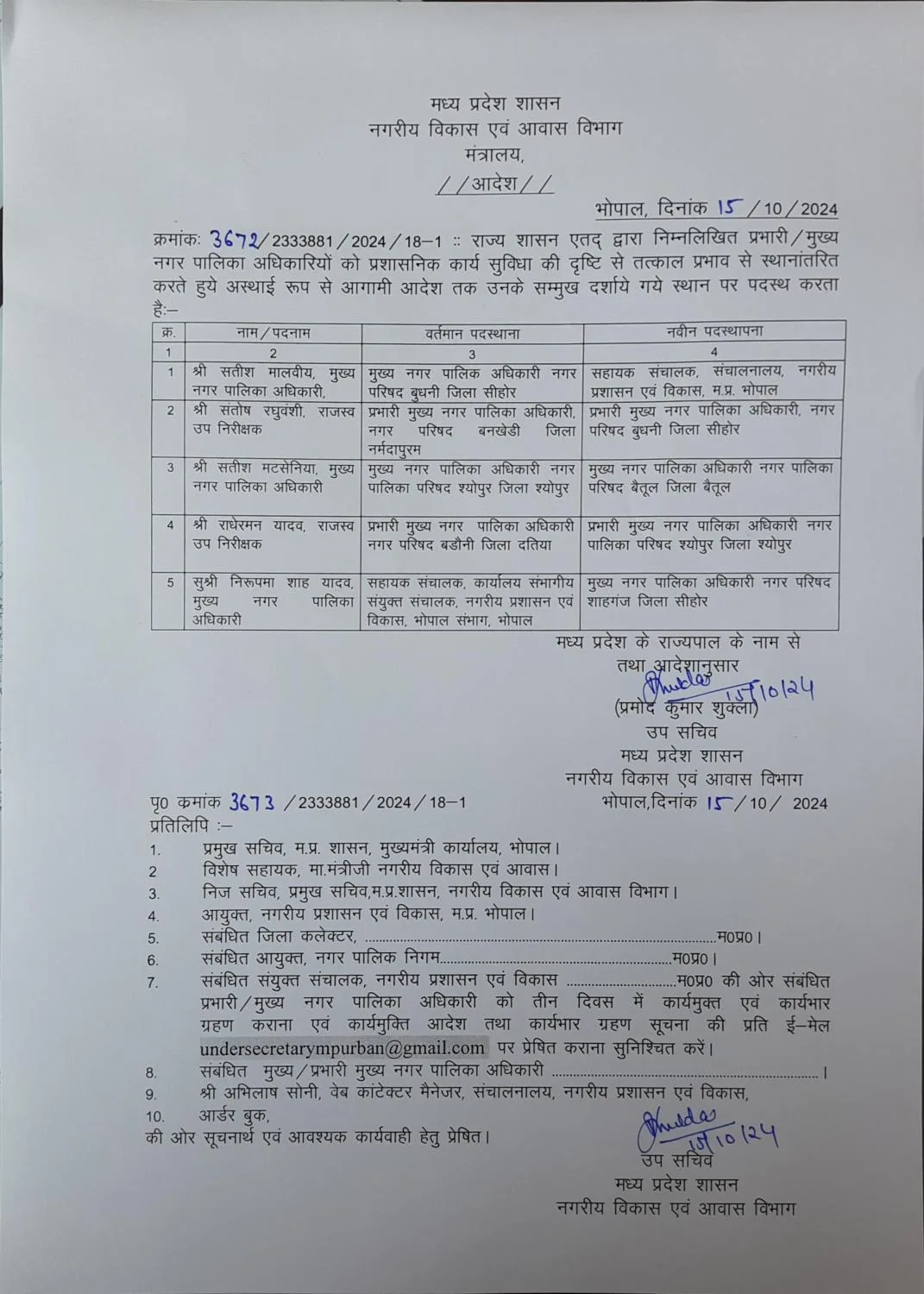 नगर पालिका अधिकारियो के तबादले – बैतूल सीएमओ होंगे सतीश मटसेनिया