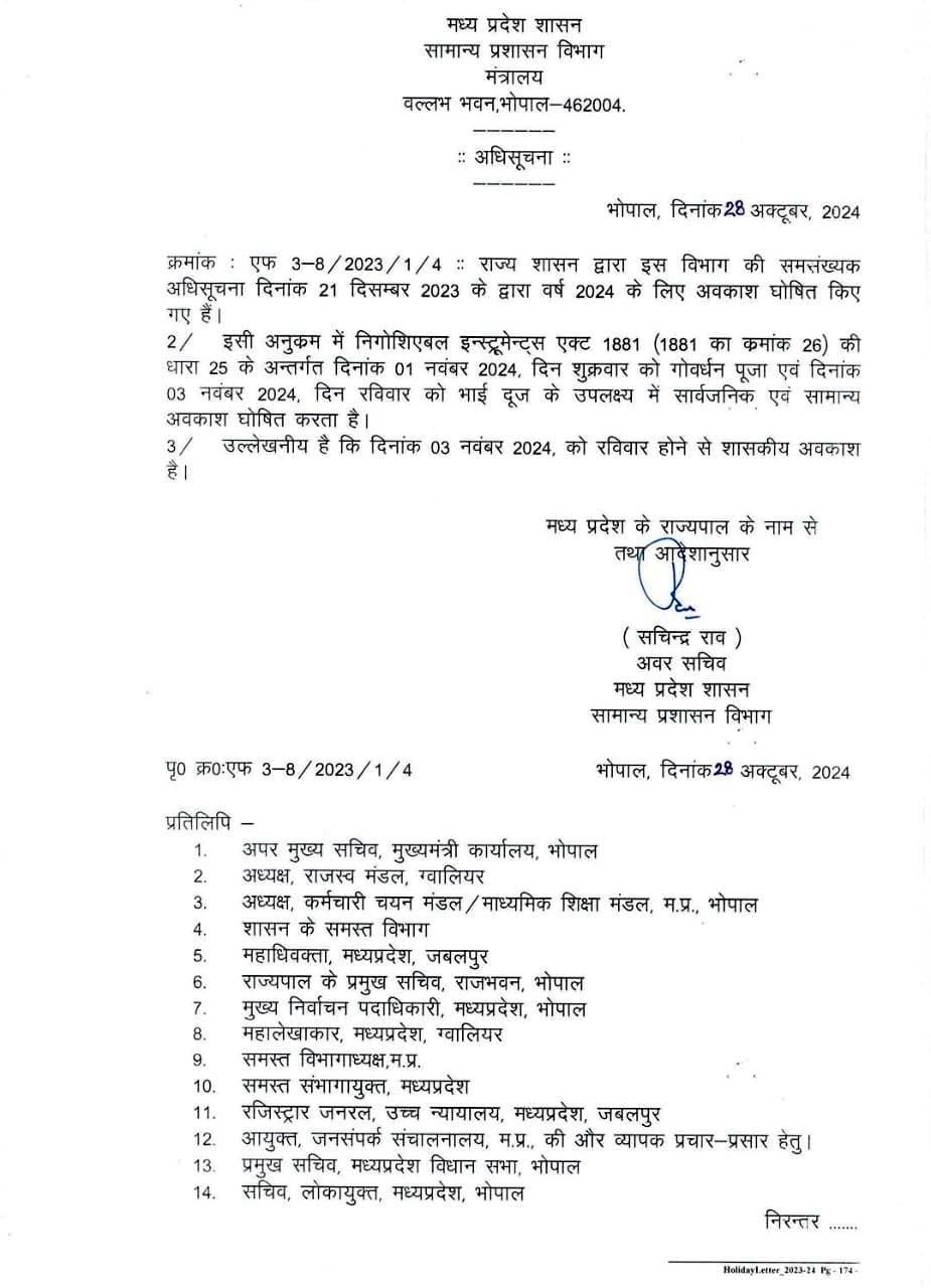 मध्य प्रदेश सरकार ने दीपावली पर गोवर्धन पूजा और भाई दूज पर सावर्जनिक अवकाश घोषित कर दिया है। इसके सोमवार को सामान्य प्रशासन विभाग (जीएडी) ने आदेश जारी किए है। आदेश में निगोशियएल इन्स्ट्रूमेंन्टस एक्ट 1881 की धारा 25 के अंतर्गत 1 नवंबर दिन शुक्रवार को गोवर्धन पूजा एवं तीन नंवबर दिन रविवार को भाई दूज के उपलक्ष्य में सार्वजनिक एवं सामान्य अवकाश घोषित किया है। बता दें तीन नवंबर को रविवार होने से शासकीय अवकाश है।