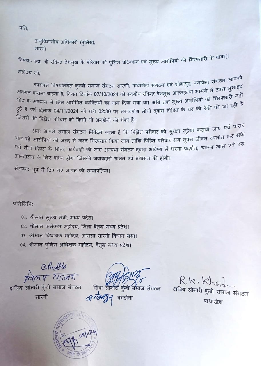 कुन्बी समाज संगठन सारणी, पाथाखेडा संगठन एवं शोभापुर, बगडोना संगठन का कहना है की दिनांक 07/10/2024 को स्वर्गीय रविन्द्र देशमुख आत्महत्या मामले में उक्त सुशाइट नोट के माध्यम से जिन आरोपित व्यक्तियों का नाम दिया गया था। अभी तक मुख्य आरोपियों की गिरफ्तारी नहीं हुई है एवं दिनांक 04/11/2024 को रात्री 02:30 पर नकाबपोश लोगो द्वारा पिडित के घर की रैकी की जा रही है , जिससे की पिडित परिवार को किसी भी अनहोनी की शंका है।