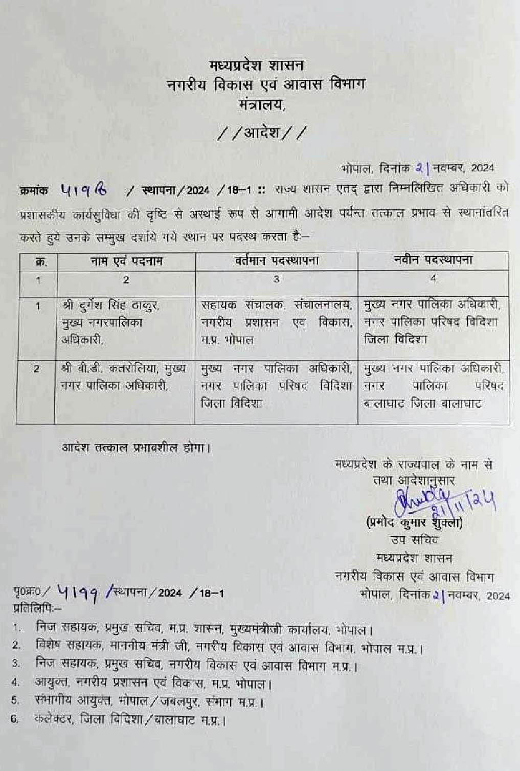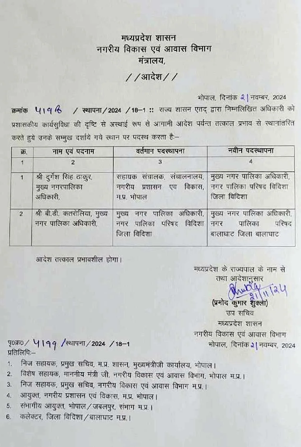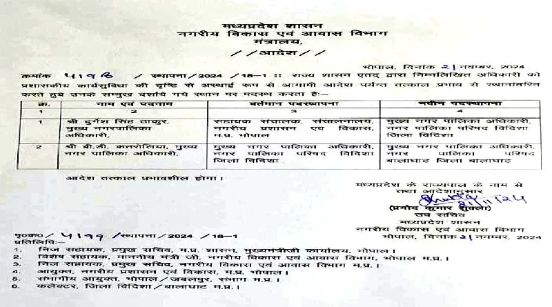 Betul मुख्य नगर पालिका अधिकारीयों के स्थानांतरण आदेश November 22, 2024 scnnewsindia.com Scn News Indiaब्यूरो रिपोर्ट राज्य शासन द्वारा निम्नलिखित अधिकारी को प्रशासकीय कार्यसुविधा की दृष्टि से अस्थाई रूप से आगामी आदेश पर्यन्त तत्काल प्रभाव से स्थानांतरित किया गया।