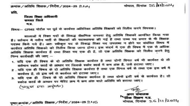 पत्र में कहा गया है कि मध्य प्रदेश की शालाओं में रिक्त पदों पर शैक्षणिक समस्या का समाधान करने के लिए अतिथि शिक्षकों को आमंत्रित किया गया है. वर्तमान में नवीन भर्ती से शिक्षकों की पदस्थापना की गई है. इसके अलावा उच्च पद प्रभार से भी शिक्षक पदस्थ किए गए हैं. ऐसी स्थिति में एक ही विषय में एक से अधिक शिक्षक की शालाओं में पदस्थी हो तो उन्हें तुरंत रिलीव किया जाए.