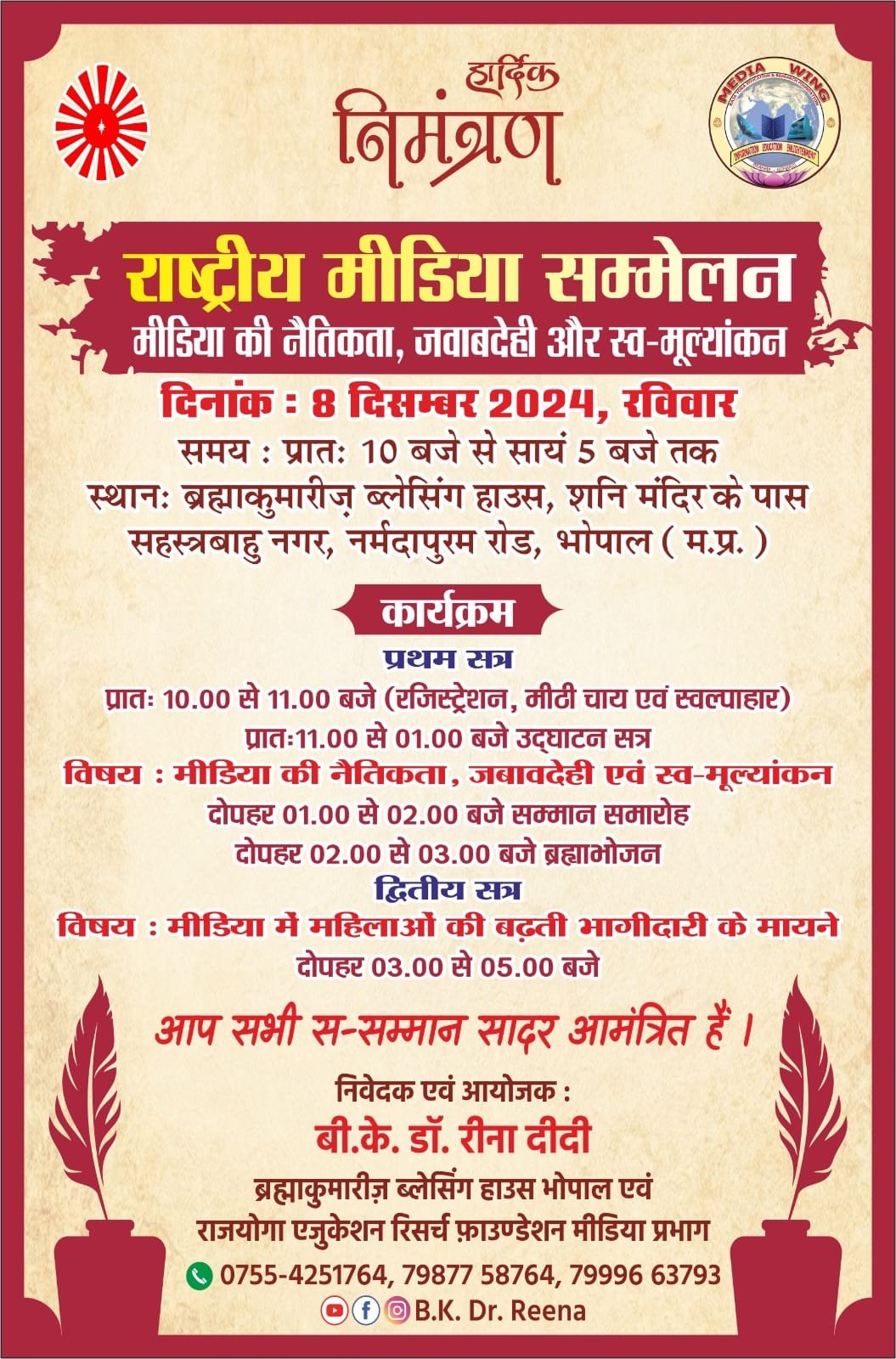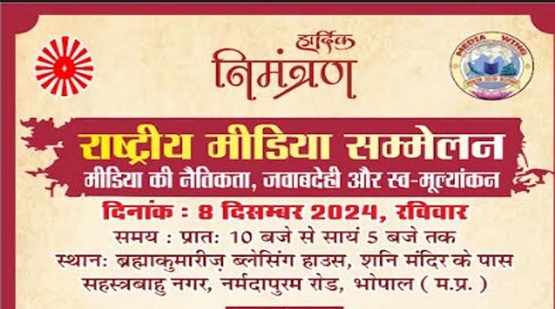 प्रजापिता ब्रह्माकुमारी ईश्वरीय विश्वविद्यालय भोपाल एवं मीडिया प्रभाग (राजयोग शिक्षण एवं अनुसंधान संस्थान ) द्वारा ‘आध्यात्मिक सशक्तिकरण द्वारा स्वच्छ एवं स्वस्थ समाज’ थीम के अंतर्गत राष्ट्रीय मीडिया सम्मेलन का आयोजन किया जा रहा है | एक दिवसीय राष्ट्रीय मीडिया सम्मेलन का आयोजन रविवार दिनांक 8 दिसम्बर 2024 को ब्रह्माकुमारीज, ब्लेसिंग हाउस, शनि मंदिर के पास, नर्मदापुरम रोड, भोपाल (म. प्र. ) में किया जा रहा है, जिसमे देशभर से जुटे कुशल वक्ता विषय पर मंथन करेंगे | सम्मेलन के अंतर्गत प्रथम सत्र ‘मीडिया की नैतिकता, जवाबदेही और स्व-मूल्यांकन’ विषय पर केंद्रित होगा एवं द्वितीय सत्र ‘मीडिया में महिलाओं की बढ़ती भागीदारी के मायने’ विषय पर होगा |