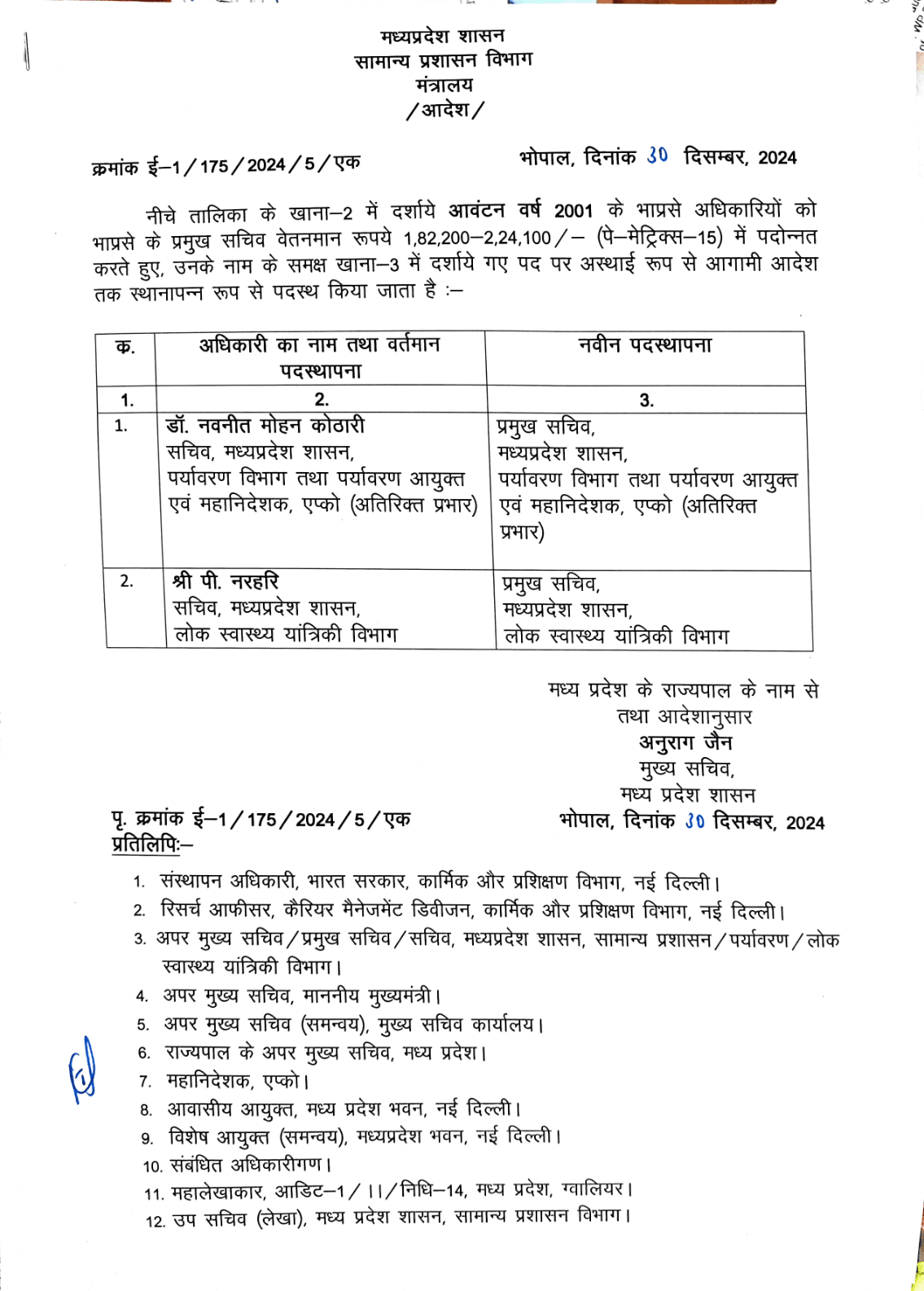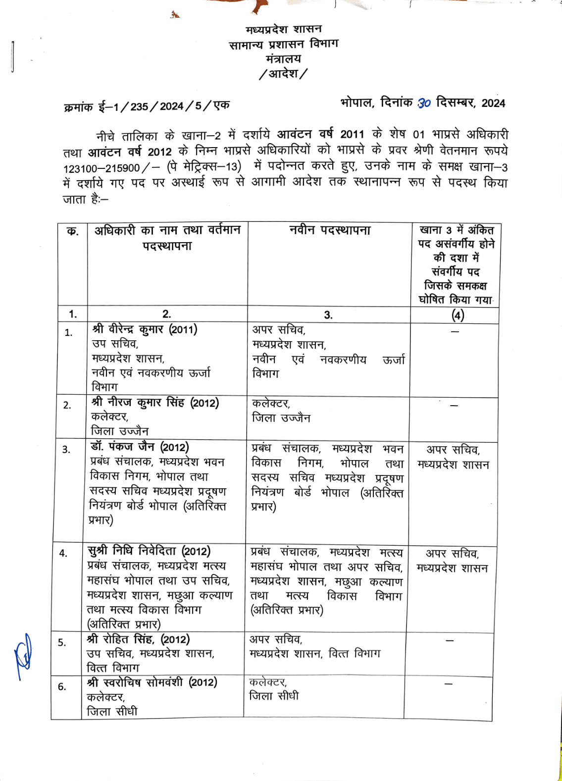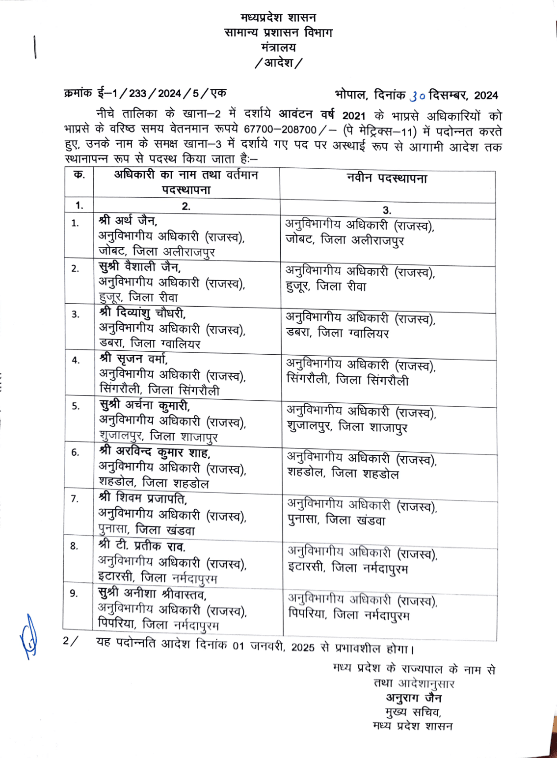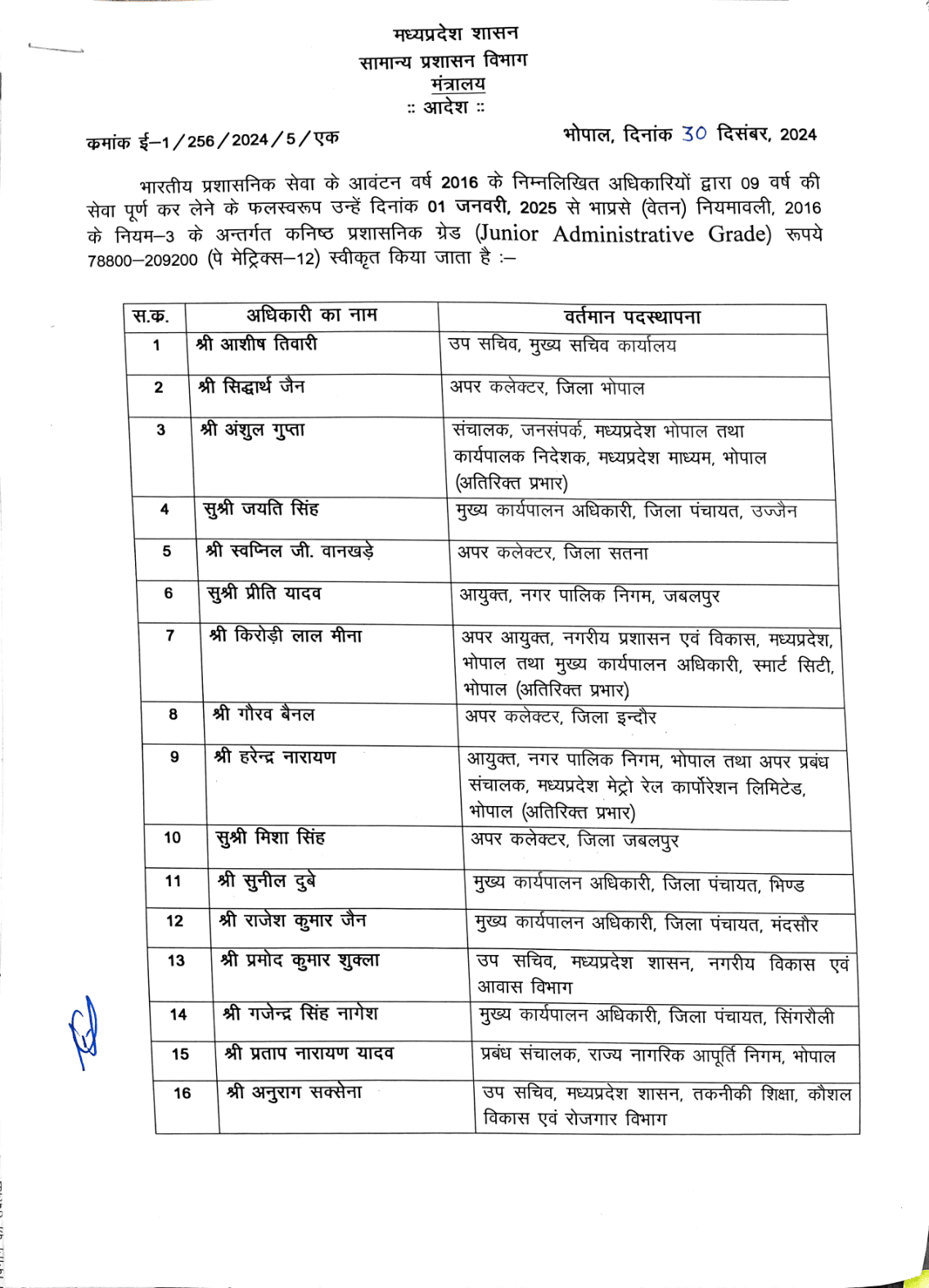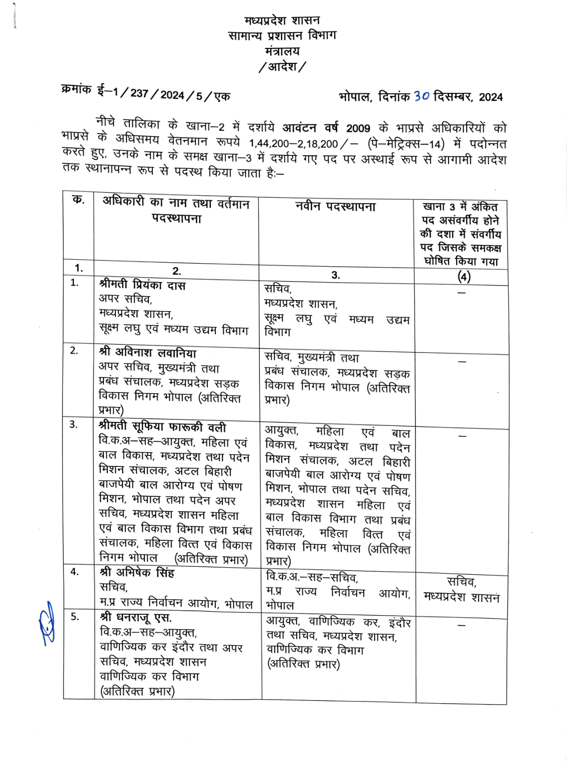 मध्यप्रदेश में मोहन यादव की सरकार ने भारतीय सेवा अधिकारियों को नए साल में प्रमोशन का तोहफा दिया है। बैच 2016, 2011, 2012, 2001, 2021 और 2009 के आईएएस अधिकारियों को प्रमोट किया गया है। जिसके सामान्य प्रशासन विभाग ने आदेश जारी कर दिया है।