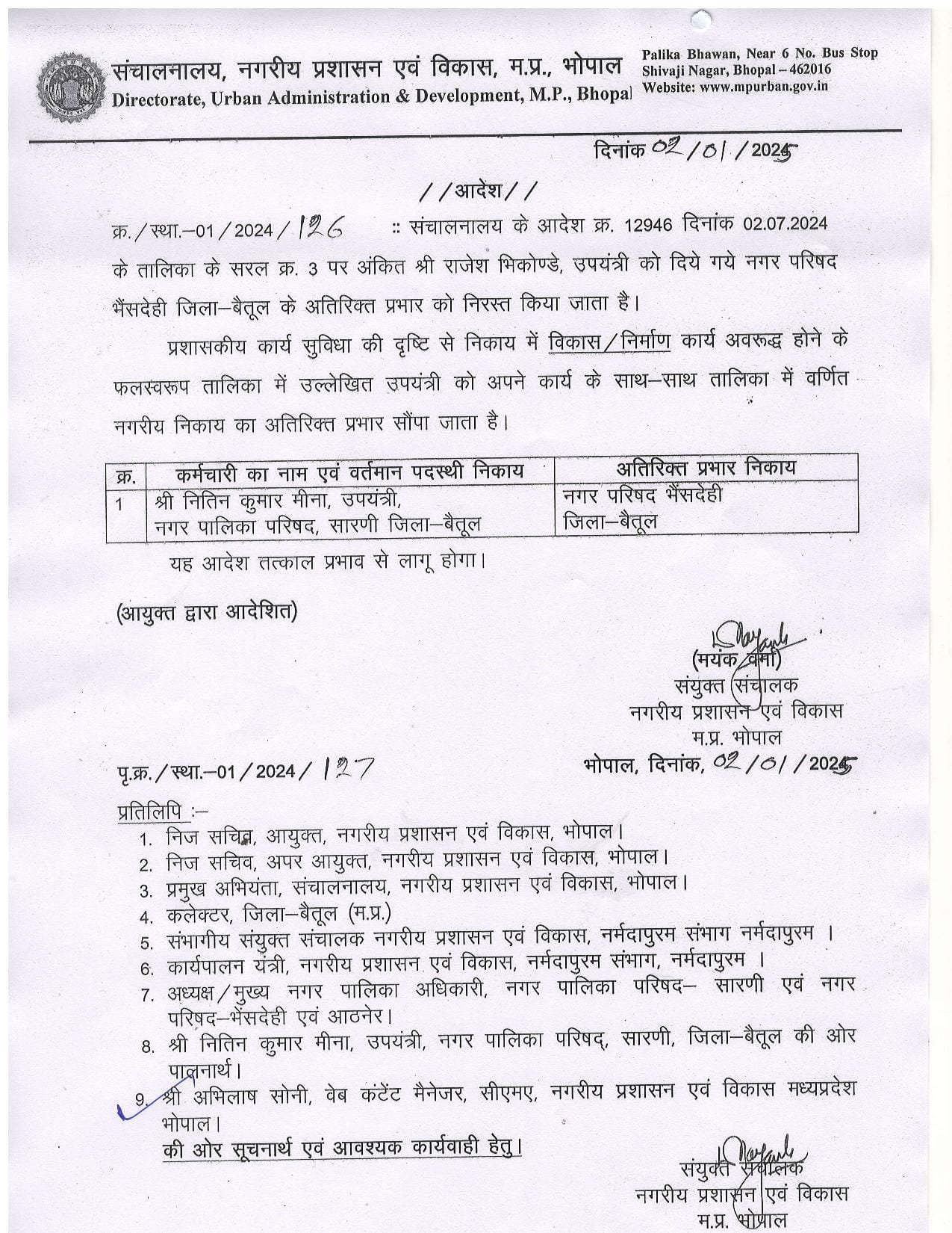 सारणी के उपयंत्री नितिन कुमार मीना को नगर परिषद भैंसदेही का अतिरिक्त प्रभार