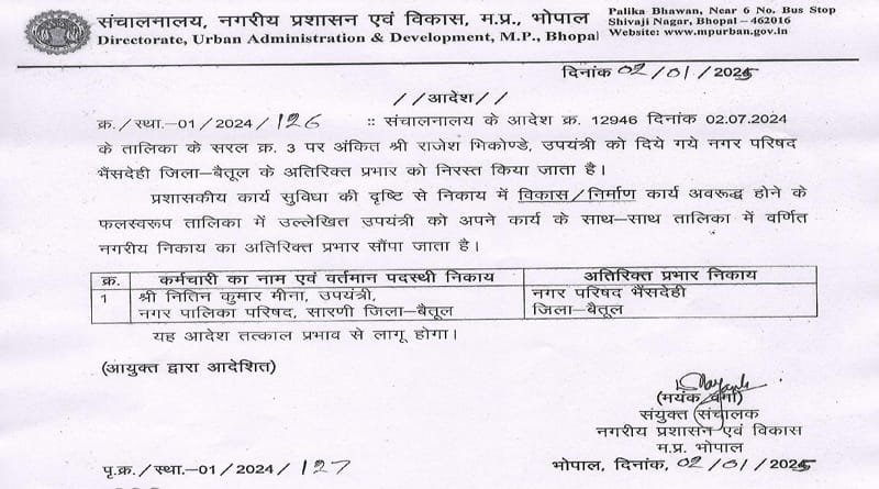 नगरीय प्रशासन एवं विकास, म.प्र., भोपाल द्वारा नगर पालिका परिषद, सारणी के उपयंत्री नितिन कुमार मीना को नगर परिषद भैंसदेही का अतिरिक्त प्रभार निकाय सौपा गया है। जिसके आदेश जारी किये गए है। बता दे की इसके पूर्व नगर परिषद् आठनेर के उपयंत्री राजेश भिकोंडे को यहाँ का अतिरिक्त प्रभार सौपा गया था। जिसे निरस्त कर उपयंत्री नितिन कुमार मीना को नगर परिषद भैंसदेही का अतिरिक्त प्रभार निकाय सौपा गया है।