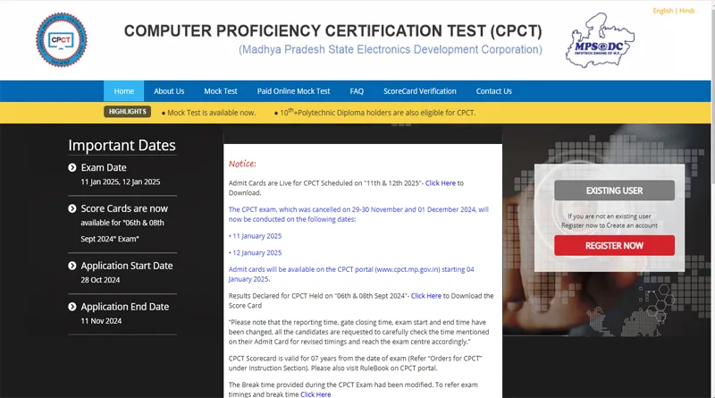 मध्य प्रदेश स्टेट इलेक्ट्रॉनिक्स डेवलपमेंट कॉर्पोरेशन (एमपीएसईडीसी) से प्राप्त जानकारी अनुसार 29, 30 नवंबर और 1 दिसम्बर 2024 को तकनीकी कारणों से रद्द की गई सीपीसीटी (कंप्यूटर प्रोफिशिएंसी सर्टिफिकेशन टेस्ट) परीक्षा आगामी 11 और 12 जनवरी 2025 को आयोजित की जाएगी।