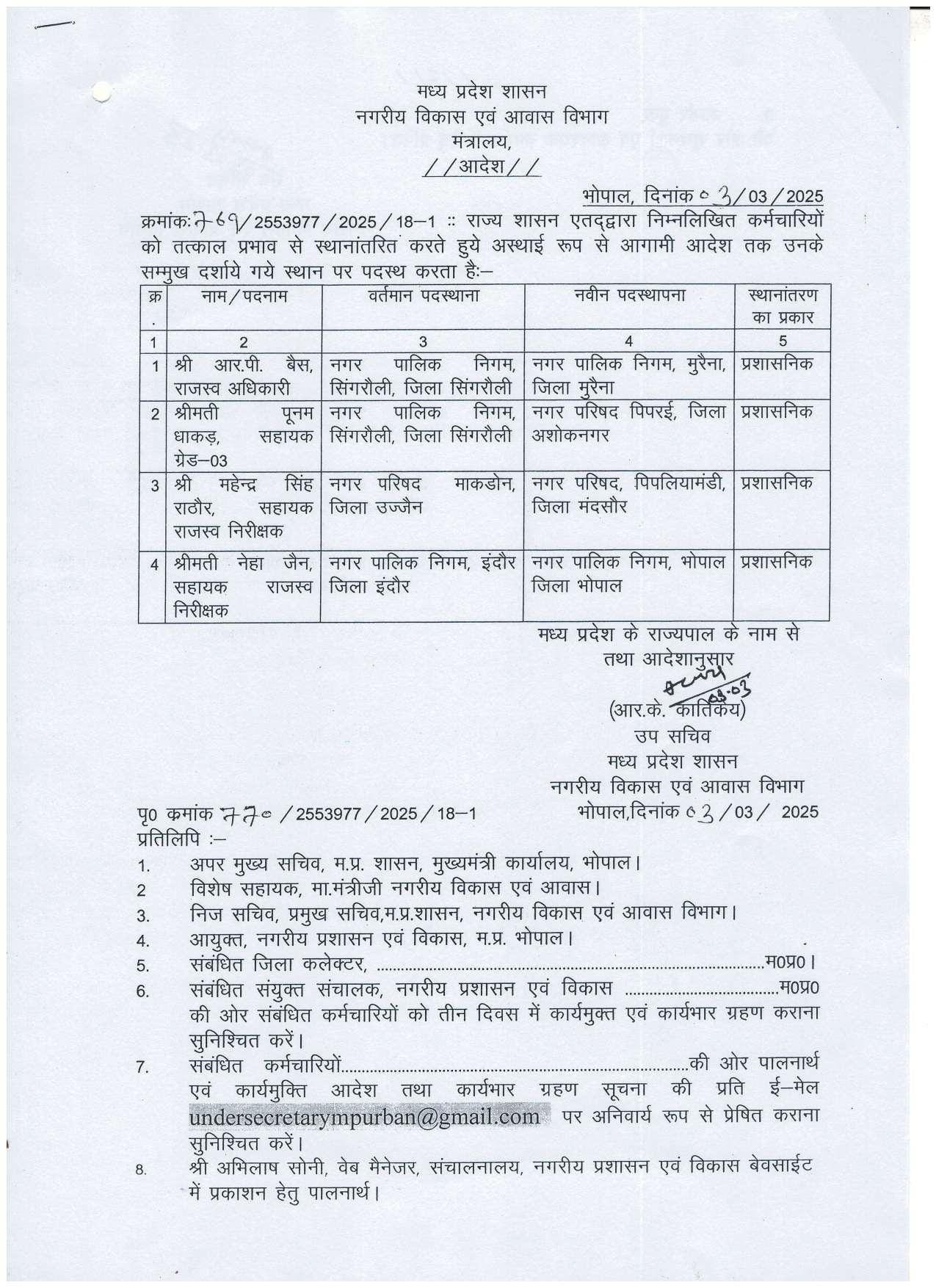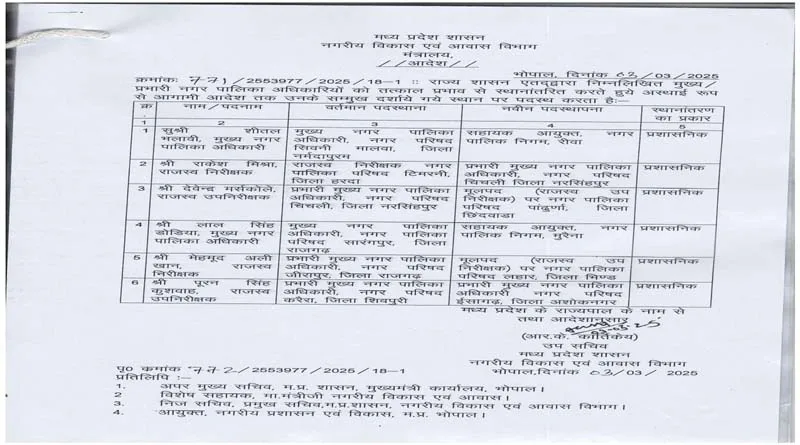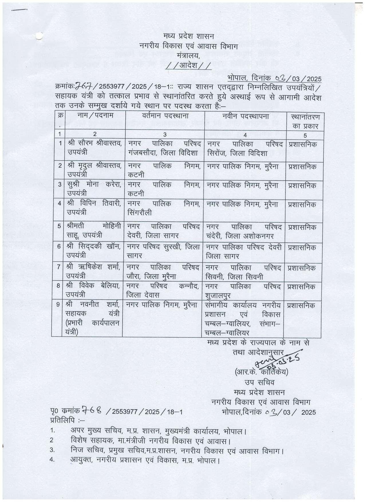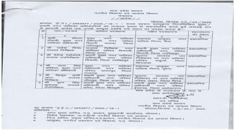 Bhopal नगर पालिका अधिकारी कर्मचारियों के तबादले -सूची जारी March 6, 2025 scnnewsindia.com Scn News Indiaब्यूरो रिपोर्ट एक बार फि नगरीय प्रशासन विभाग ने बड़े पैमाने से नगर पालिका अधिकारी कर्मचारियों के तबादले की सूचि जारी की है।