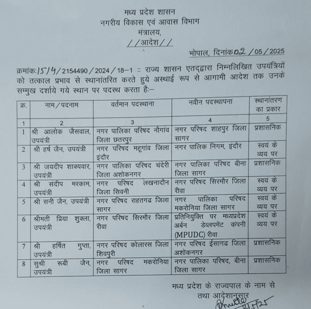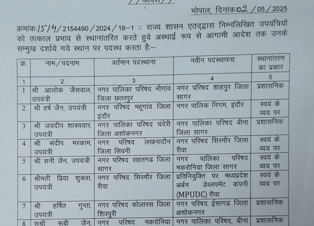 Bhopal उपयंत्रियों के स्थानांतरण आदेश May 5, 2025 scnnewsindia.com Scn News Indiaब्यूरो रिपोर्ट उपयंत्रियों के स्थानांतरण आदेश