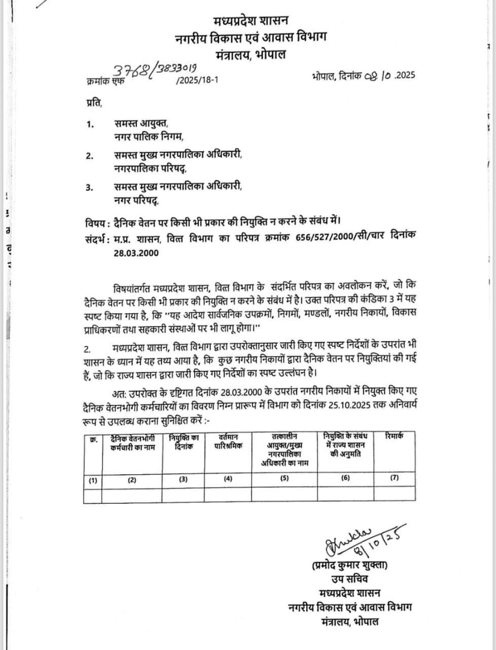 उन्होंने 28.03.2000 के उपरांत नगरीय निकायों में नियुक्त किए गए दैनिक वेतनभोगी कर्मचारियों का विवरण निम्न प्रारूप में विभाग को दिनांक 25.10.2025 तक अनिवार्य रूप से उपलब्ध कराने का निर्देश दिया है। यह आदेश सार्वजनिक उपक्रमों, निगमों, मण्डलों, नगरीय निकायों, विकास प्राधिकरणों तथा सहकारी संस्थाओं पर भी लागू होगा।”