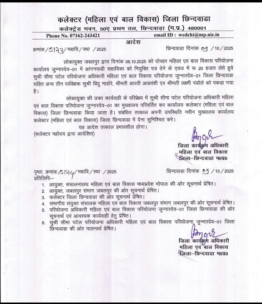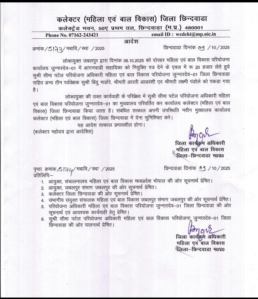 परासिया जुन्नारदेव में दीपावली के पहले महिलाबाल विकास विभाग में लोकायुक्त ने बड़ी कार्रवाई करते हुए परियोजना अधिकारी सहित तीन महिला सुपरवाइजर्स को रिश्वत लेते गिरफ्तार किया है। ये एक सहायिका को ज्वाइनिंग के बदले इनाम के रूप में 50 हजार की डिमांड कर रहीं थीं।