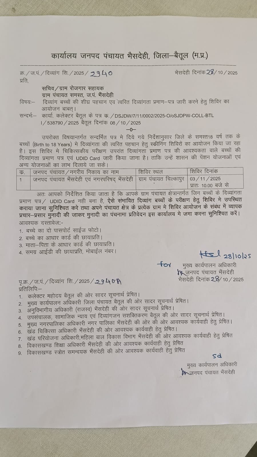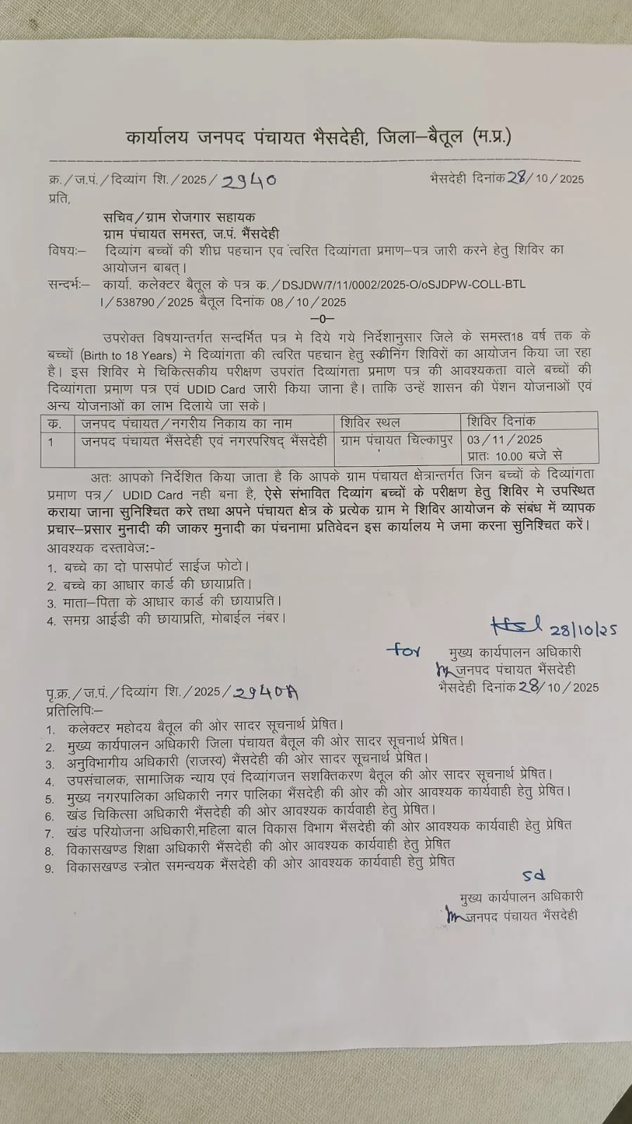 मुख्य कार्यपालन अधिकारी जनपद पंचायत भैंसदेही द्वारा आदेश जारी कर जनपद क्षेत्र के समस्त सचिव एवं रोजगार सहायकों को अपनी अपनी पंचायत क्षेत्र में शिविर का प्रभावी प्रचार प्रसार कर संभावित दिव्यांग बच्चों को परीक्षण हेतु शिविर में उपस्थित कराने के निर्देश दिए गए हैं। संबंधित बच्चों को अपने साथ स्वयं की दो पासपोर्ट साइज फोटो ,बच्चे का आधार कार्ड, बच्चे के माता-पिता के आधार कार्ड एवं समग्र परिवार आईडी की छायाप्रति व मोबाईल नंबर साथ में लाना आवश्यक होगा। जनपद पंचायत भैंसदेही द्वारा 18 वर्ष तक के संभावित दिव्यांग बच्चों को परीक्षण हेतु आज ग्राम पंचायत चिल्कापुर प्रांगण में आयोजित दिव्यांग शिविर में अधिक से अधिक संख्या में उपस्थित कराकर शिविर का लाभ लेने की अपील की गई है।