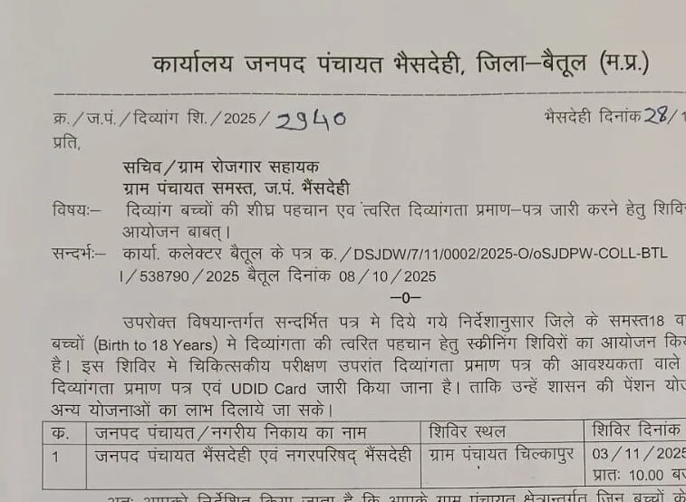 भैंसदेही:- दिव्यांग बच्चों की शीघ्र पहचान एवं त्वरित दिव्यांगता प्रमाण पत्र जारी करने के उद्देश्य से जनपद पंचायत भैंसदेही के तत्वाधान में ग्राम पंचायत चिल्कापुर प्रांगण में जनपद स्तरीय दिव्यांग शिविर का आयोजन आज 03 नवम्बर 2025 को प्रातः 10 बजे से किया गया है। मुख्य कार्यपालन अधिकारी जनपद पंचायत भैंसदेही द्वारा जारी आदेशानुसार इस शिविर में जनपद पंचायत क्षेत्र के उपस्थित समस्त 18 वर्ष तक के संभावित दिव्यांग बच्चों में दिव्यांगता की त्वरित पहचान कर उन्हे पात्रता अनुसार दिव्यांग प्रमाण पत्र (यूडीआईडी कार्ड ) जारी किए जायेंगे ताकि उन्हें शासन की पेंशन योजना एवं अन्य योजनाओं का लाभ दिलाया जा सके।
