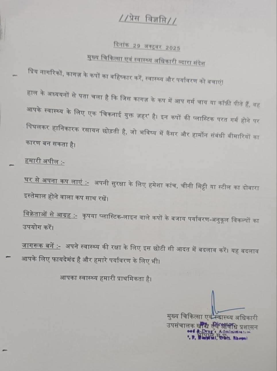 भोपाल-CMHO ने माना है की प्लास्टिक डिस्पोजल में गरम चाय ,पेय पदार्थ हानिकारक है और कैंसर का कारण हो सकता है प्रेस नोट जारी कर सभी नागरिकों से अपील की है कि इसका इस्तेमाल न करें।