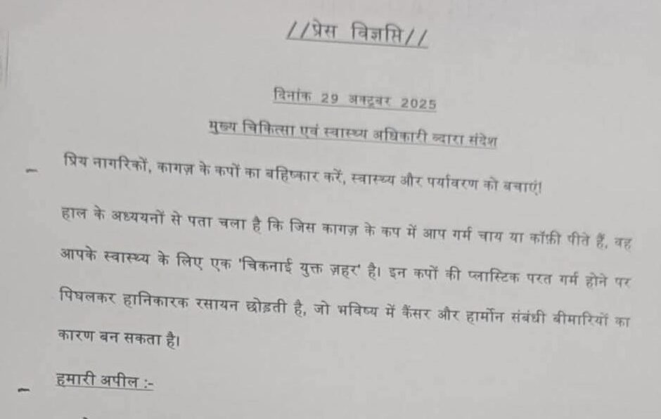 कैंसर का खतरा _कागज/प्लास्टिक डिस्पोजल में गरम चाय ,पेय पदार्थ हानिकारक : स्वास्थ्य विभाग