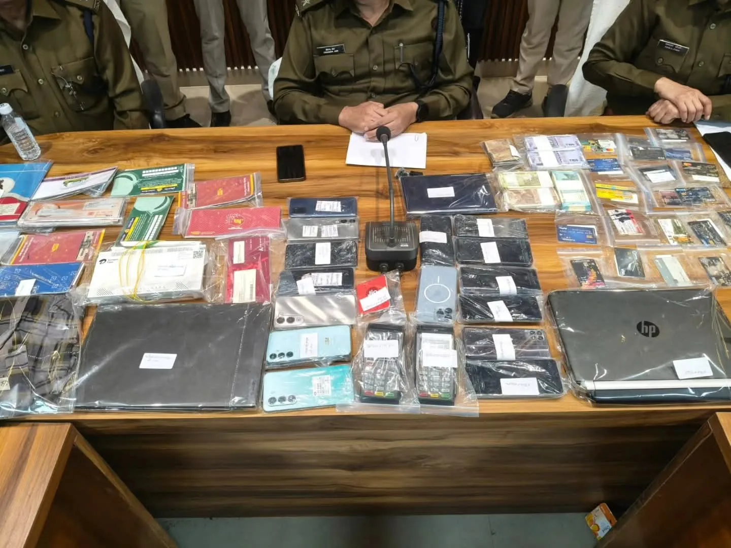 जप्त सामग्री: 15 मोबाइल फोन (25 सिम सहित), 21 ATM कार्ड, ₹28,000 नकद, 11 पासबुक, 7 चेकबुक, 2 POS मशीन, 69 ATM जमा रसीदें, ₹48,000 की पर्ची, 2 लैपटॉप, Extreme Fiber राउटर, 4 रजिस्टर/डायरी।