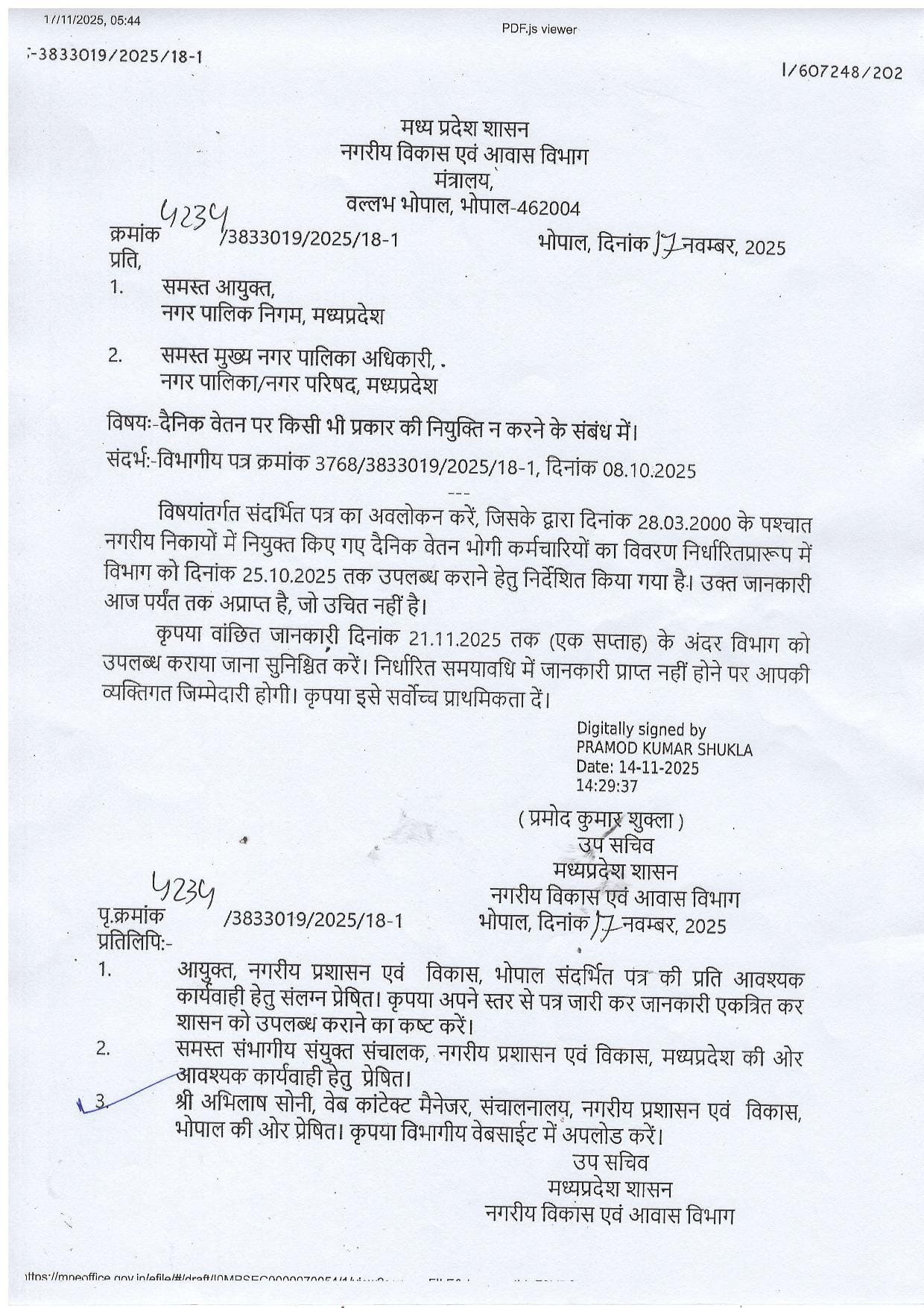 उप सचिव प्रमोद कुमार शुक्ला मध्यप्रदेश शासन नगरीय विकास एवं आवास विभाग भोपाल द्वारा समस्त आयुक्त,नगर पालिक निगम एवं समस्त मुख्य नगर पालिका अधिकारी, नगर पालिका/ नगर परिषद को पुनः पत्र लिख दैनिक वेतन पर किसी भी प्रकार की नियुक्ति न करने तथा 28.03.2000 के पश्चात नगरीय निकायों में नियुक्त किए गए दैनिक वेतन भोगी कर्मचारियों का विवरण निर्धारितप्रारूप में भेजने के सख्त निर्देश दिए है। उन्होंने कहा है की 28.03.2000 के पश्चात • नगरीय निकायों में नियुक्त किए गए दैनिक वेतन भोगी कर्मचारियों का विवरण निर्धारितप्रारूप में विभाग को दिनांक 25.10.2025 तक उपलब्ध कराने हेतु निर्देशित किया गया है। उक्त जानकारी आज पर्यंत तक अप्राप्त है, जो उचित नहीं है।