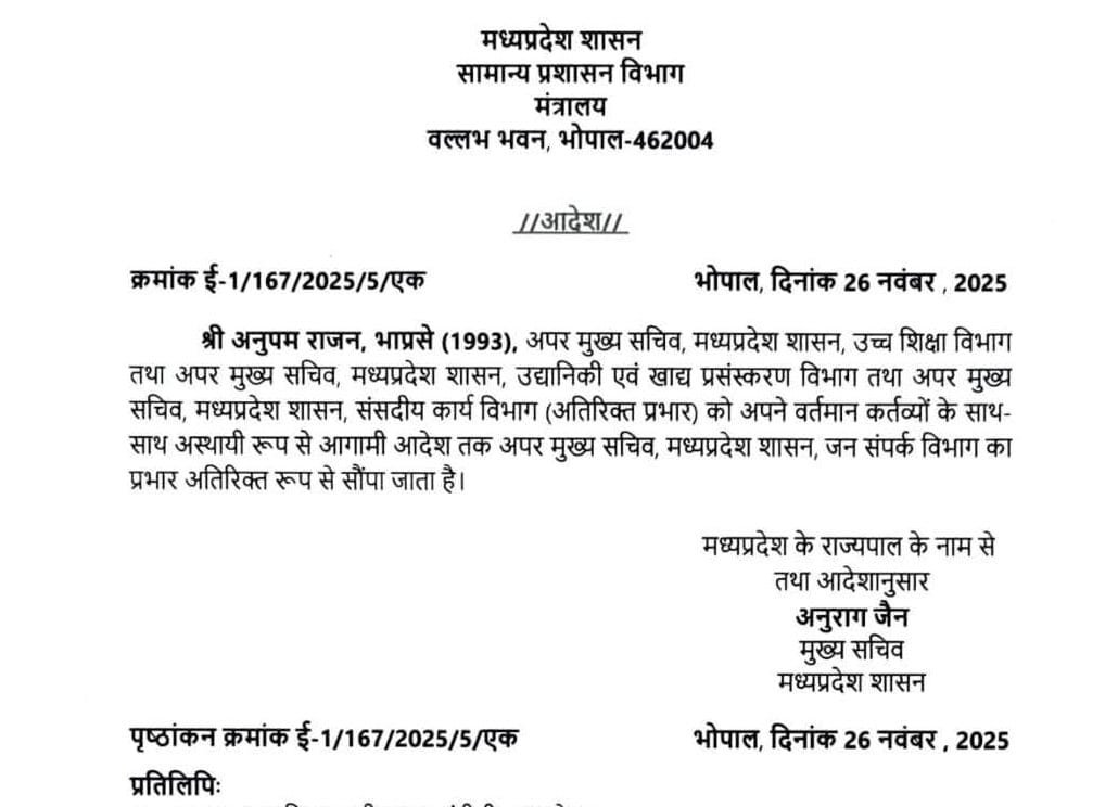 सामान्य प्रशासन विभाग द्वारा भाप्रसे के अधिकारी श्री अनुपम राजन, अपर मुख्य सचिव (उच्च शिक्षा, उद्यानिकी एवं खाद्य प्रसंस्करण, संसदीय कार्य विभाग (अतिरिक्त प्रभार) को वर्तमान कर्तव्यों के साथ अपर मुख्य सचिव, जनसंपर्क विभाग का अतिरिक्त प्रभार सौंपे जाने के जारी किए गए आदेश ।