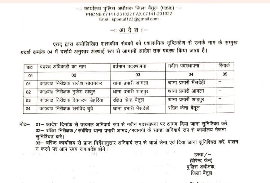 Betul बैतूल पुलिस अधीक्षक जैन ने 4थानों के प्रभारी बदले scnnewsindia.com November 27, 2025 Scn News Indiaब्यूरो रिपोर्ट बैतूल पुलिस अधीक्षक वीरेन्द्र जैन ने पुलिस विभाग में 4थानों के प्रभारी बदलने के आदेश जारी किए है ।जिसमें बैतूल भैंसदेही शाहपुर और आमला शामिल है।Post navigationPrevious: पुलिस महानिदेशक श्री मकवाणाने वीडियो कॉन्फ्रेंसिंग के माध्यम से प्रदेश में कानून व्यवस्था की व्यापक समीक्षा कीNext: मुख्यमंत्री डॉ. मोहन यादव के निर्देश पर एसपी को किया पुलिस मुख्यालय अटैच Related News Betul सांसद खेल महोत्सव फिट युवा फॉर विकसित भारत 2025 खेलो का आयोजन scnnewsindia.com December 18, 2025 Betul जिला अस्पताल में 2017 से 2022 तक के पुराने दस्तावेज होंगे कंडम scnnewsindia.com December 18, 2025 Betul मुझे गर्व है कि मैं सरस्वती शिशु मंदिर का पूर्व छात्र हूं – मुख्य अभियंता श्री विनोद कैथवार सतपुड़ा ताप विद्युत केंद्र सारणी scnnewsindia.com December 18, 2025
