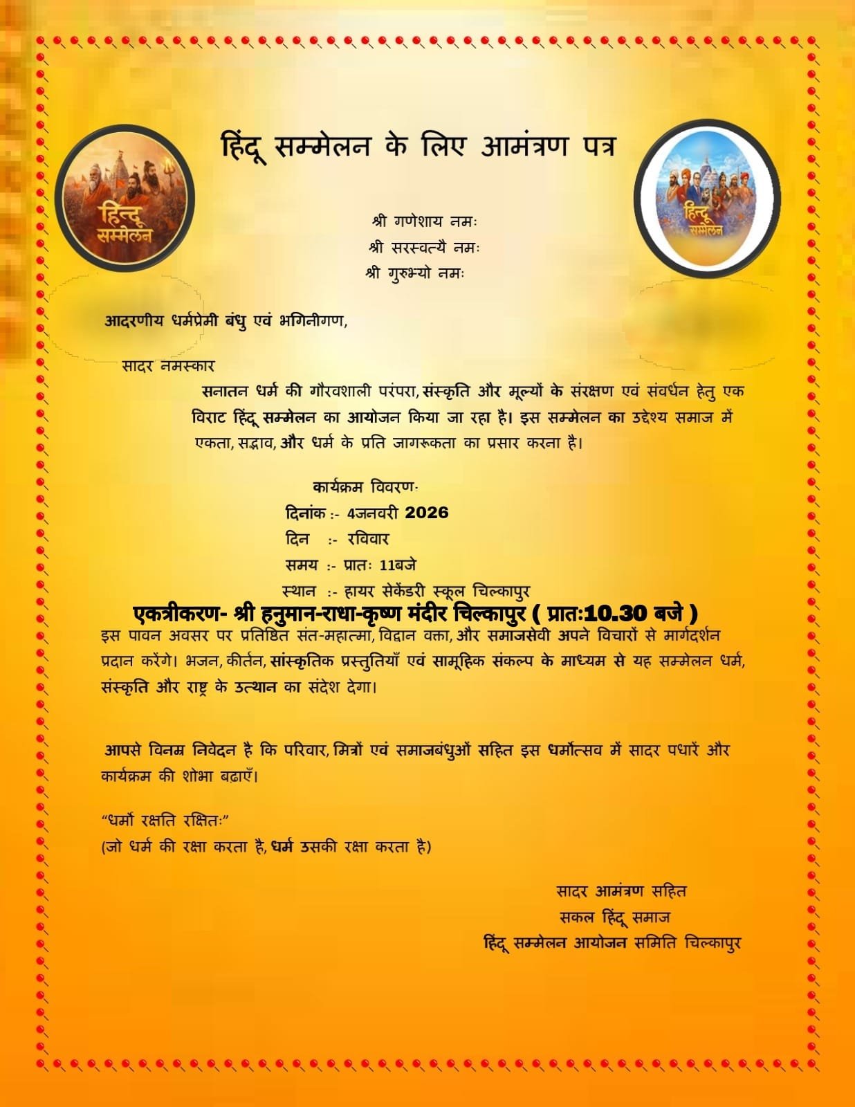 जिसमें चिल्कापुर मंडल में सम्मिलित ग्राम चिल्कापुर,गुदगांव, राजनी,ठेमगांव, ढोण्डी, रामघाटी,हनुमानढ़ाना, पिपरिया एवं सिरजगांव के ग्रामवासी सम्मेलन में भाग लेंगे। सभी हिन्दू जन प्रातः 10 बजे चिल्कापुर स्थित श्री राधा- कृष्ण-हनुमान मंदीर प्रांगण में एकत्र होंगे जहां पूजन अर्चन के पश्चात् गाजे बाजे एवं हर्षोल्लास के साथ चिल्कापुर,गुदगांव के प्रमुख मार्गो से होते हुए शोभायात्रा निकाली जायेगी जिसका समापन सम्मेलन स्थल पर होगा ।