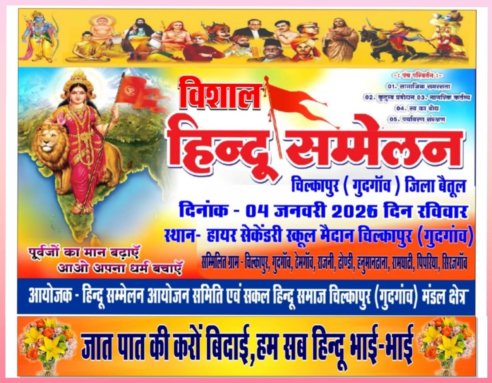 भैंसदेही:- सकल हिन्दू समाज द्वारा हिंदुओं को एकजुट कर समाज में समरसता के भाव को मजबूत करने के उद्देश्य से 04 जनवरी 2026 दिन रविवार को ग्राम चिल्कापुर के हायर सेकंडरी स्कूल मैदान पर विशाल हिन्दू सम्मेलन का आयोजन किया गया है।
