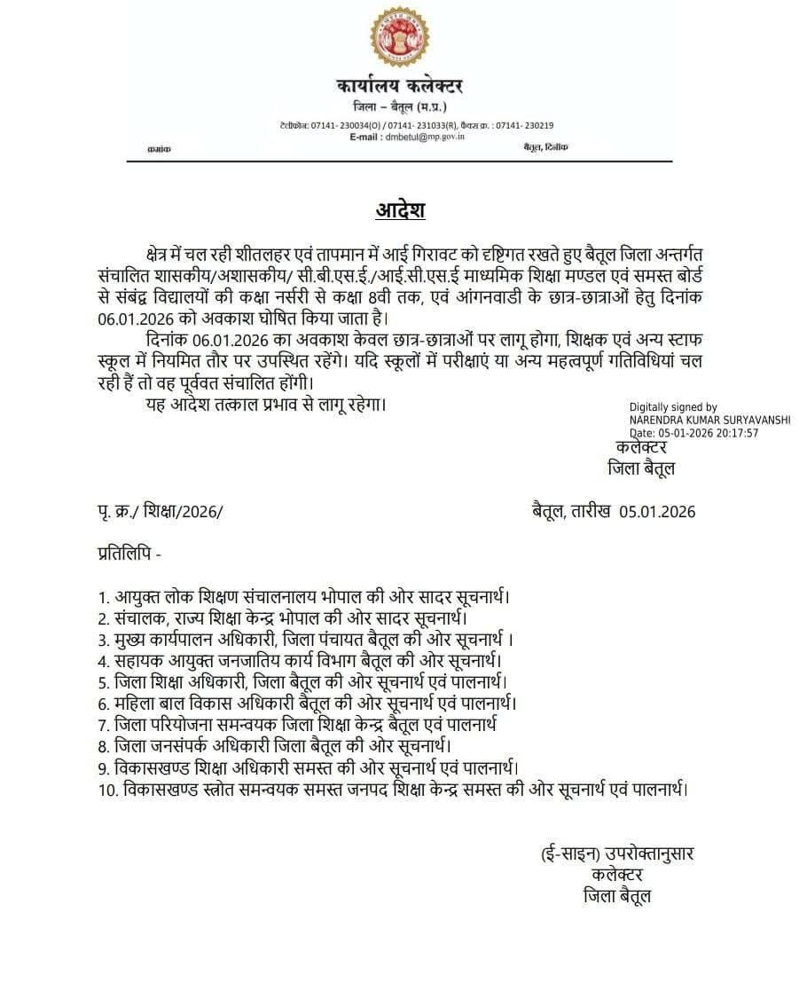 क्षेत्र में जारी शीतलहर एवं तापमान में आई गिरावट को दृष्टिगत रखते हुए कलेक्टर बैतूल श्री नरेन्द्र कुमार सूर्यवंशी द्वारा जिले के समस्त शासकीय, अशासकीय, सीबीएसई, आईसीएसई, माध्यमिक शिक्षा मण्डल एवं अन्य सभी बोर्ड से संबद्ध विद्यालयों में अध्ययनरत कक्षा नर्सरी से कक्षा 8वीं तक के छात्र-छात्राओं के लिए 06 जनवरी 2026 को अवकाश घोषित किया गया है।
