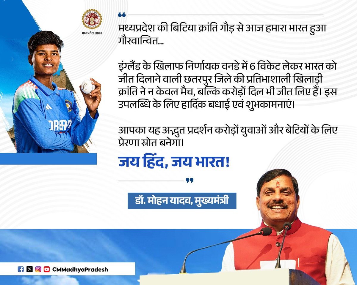 गौरतलब है कि विगत दिनों महिला वनडे वर्ल्ड कप में भारतीय महिला क्रिकेट टीम की ऐतिहासिक जीत के बाद आयोजित सम्मान समारोह के दौरान मुख्यमंत्री डॉ. यादव ने उत्कृष्ट प्रदर्शन करने वाली प्रदेश की प्रतिभाशाली क्रिकेटर क्रांति गौड़ से उनके पिता की नौकरी बहाल करने का आश्वासन दिया था। जिसे उन्होंने नियमों के तहत निभाया है।