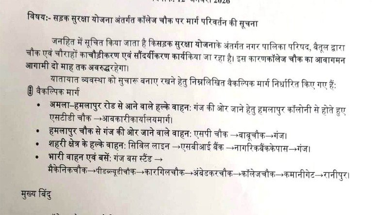 नगर पालिका परिषद बैतूल द्वारा बताया गया की कार्य की अवधि में कॉलेज चौक का मार्ग बंद रहेगा। नागरिकों से अनुरोध है कि वे उपरोक्त वैकल्पिक मार्गों का उपयोग करें। यह व्यवस्था दो माह तक लागू रहेगी।