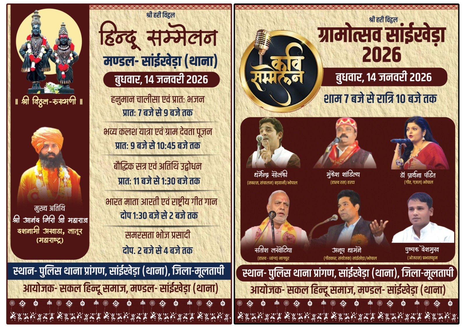 सांईखेड़ा :- 14 जनवरी मकर संक्रांति पर होगा हिन्दू सम्मेलन ग्रामोत्सव व विशाल भंडारे का आयोजन रात्रि कालीन 8:00 बजे होगा कवि सम्मेलन आयोजन को लेकर विगत दस दिनों से चल रही है तैयारी 14 गांव के पांच हज़ार से भी ज्यादा लोग होंगे सम्मेलन के आयोजन में शामिल समरसता के भाव से एक मुट्ठी अनाज हर गांव के हर घर से संकलन किया गया।