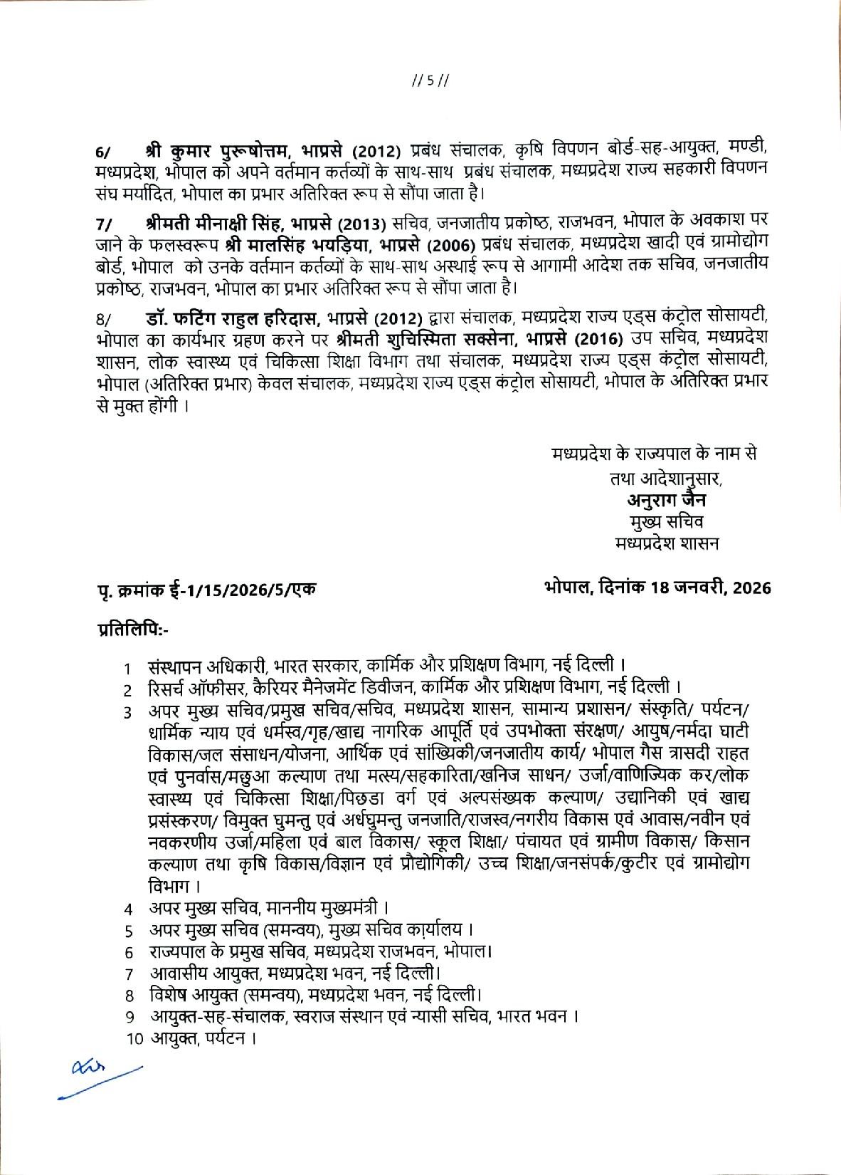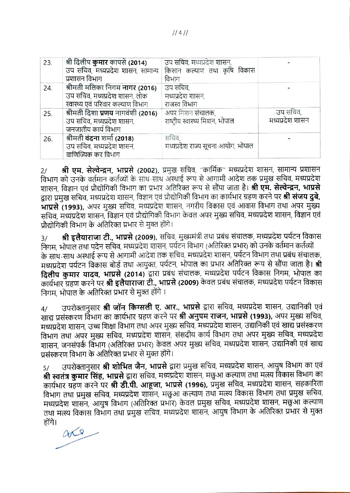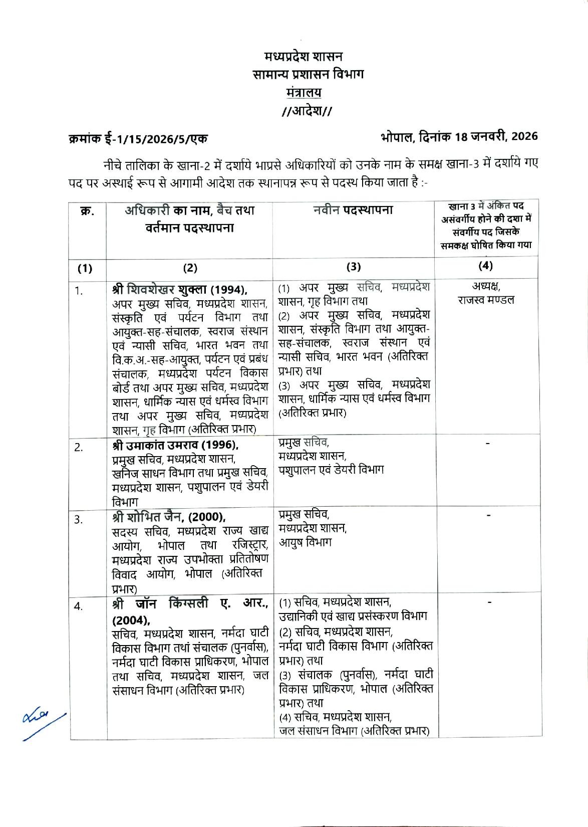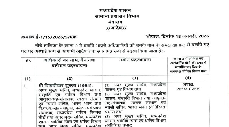 Bhopal 26 आईएएस अधिकारियों के तबादले -सूची जारी scnnewsindia.com January 19, 2026 Scn News Indiaब्यूरो रिपोर्ट भारतीय प्रशासनिक सेवा के अधिकारियों की नवीन पदस्थापना Post navigationPrevious: नाबालिक को लड़की भागने पर जमकर पीटा और निर्वस्त्र कर रस्सी बाँध नगर में घुमायाNext: सुप्रीम कोर्ट का 2011 फैसला: ‘एक राष्ट्र, एक शिक्षा’ का आदेश और कांग्रेस की RTE नीति से कैसे हुआ विफल? Related News Bhopal 125 कालोनियां अवैध, बुलडोजर चलाएगा प्रशासन, प्रशासन ने की इन क्षेत्रो में इन्वेस्टमेंट ना करने की अपील scnnewsindia.com January 18, 2026 Bhopal पशुपालन एवं पशु कल्याण को लेकर प्रदेश भर में चलेगा एक माह का जागरूकता अभियान scnnewsindia.com January 18, 2026 Bhopal केंद्रीय सड़क परिवहन मंत्री श्री गडकरी करेंगे 4,400 करोड़ रूपये की 8 राष्ट्रीय राजमार्ग परियोजनाओं का लोकार्पण–शिलान्यास scnnewsindia.com January 17, 2026