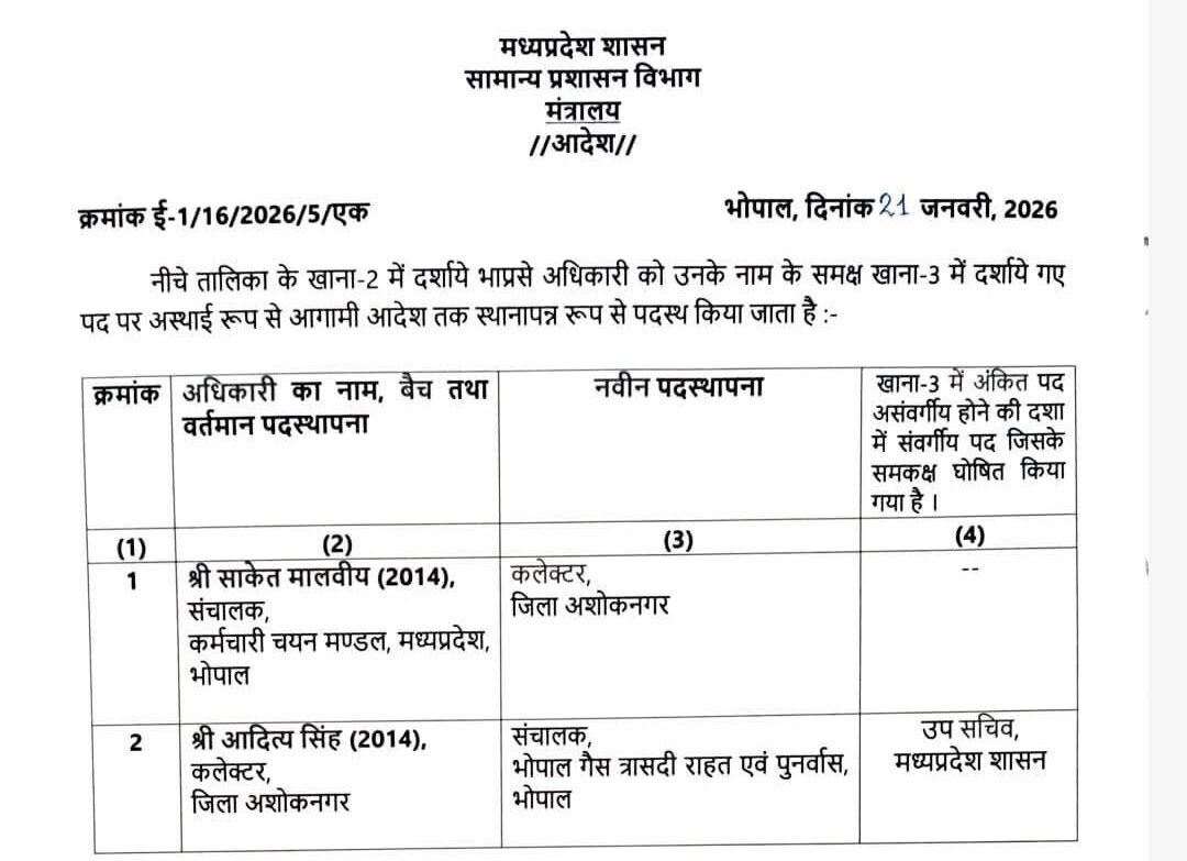 Bhopal भारतीय प्रशासनिक सेवा के अधिकारी के तबादले scnnewsindia.com January 22, 2026 Scn News Indiaब्यूरो रिपोर्ट सामान्य प्रशासन विभाग द्वारा भारतीय प्रशासनिक सेवा के अधिकारी श्री साकेत मालवीय की नवीन पदस्थापना के आदेश जारी Post navigationPrevious: पति का तलवार से कटवाया सिर.. थाने में महिला बोली- करता था अननेचुरल सेक्स, 4 आरोपी गिरफ्तार,Next: शिवराज सिंह चौहान और श्रीमती साधना सिंह चौहान बने दादा-दादी Related News Bhopal शिवराज सिंह चौहान और श्रीमती साधना सिंह चौहान बने दादा-दादी scnnewsindia.com January 22, 2026 Bhopal उच्च न्यायालय के निर्देशों की अवहेलना पर संयुक्त संचालक निलंबित scnnewsindia.com January 21, 2026 Bhopal जीबीएस नामक बीमारी ने बरपाया कहर, दो बच्चों की मौत, 15 बच्चे संक्रमित,डिप्टी सीएम और स्वास्थ्य मंत्री राजेंद्र शुक्ला पहुंचे अस्पताल scnnewsindia.com January 21, 2026