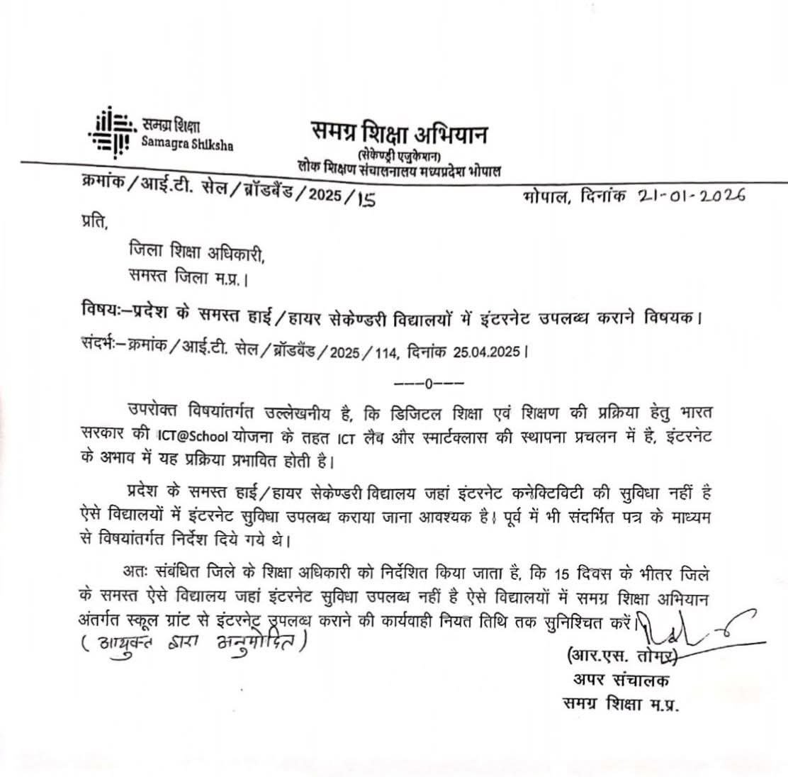 प्रदेश के समस्त हाई और हायर सेकेंडरी विद्यालयों में इंटरनेट सुविधा उपलब्ध कराना अब अनिवार्य कर दिया गया है। समग्र शिक्षा अभियान (सेकेण्ड्री एजुकेशन) अंतर्गत लोक शिक्षण संचालनालय, मध्यप्रदेश भोपाल ने इस संबंध में सभी जिला शिक्षा अधिकारियों को निर्देश जारी किए हैं।