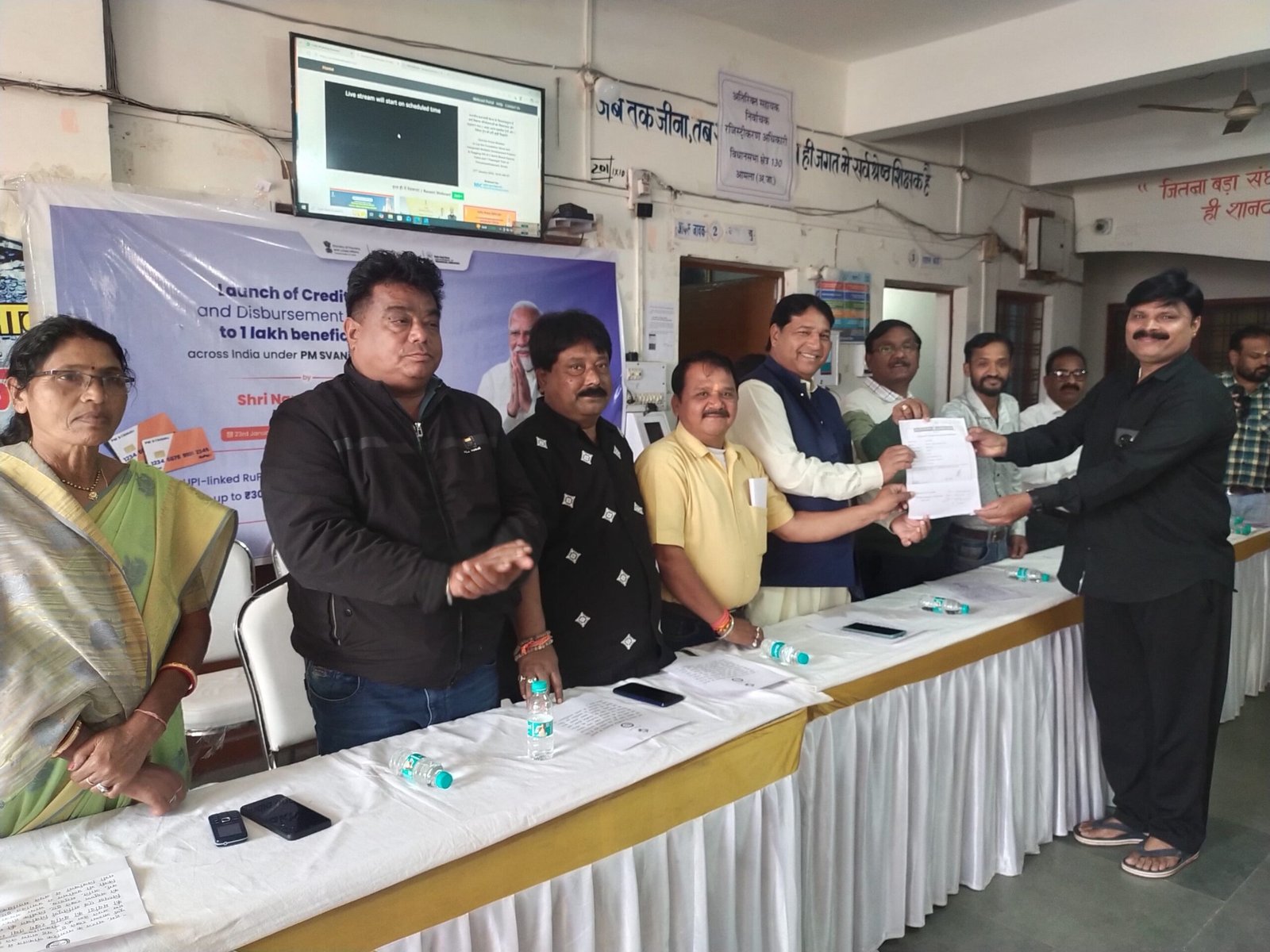 सारनी। नगर पालिका परिषद सारनी में शुक्रवार 23 जनवरी को केरल के तिरूवनंतपुरम् में आयोजित प्रधानमंत्री के कार्यक्रम का सीधा प्रसारण किया गया। इस अवसर पर जनप्रतिनिधियों की मौजूदगी में पी.एम. स्वनिधि योजना के ऋण एवं क्रेडिट कार्ड स्वीकृति पत्रों का वितरण किया गया।