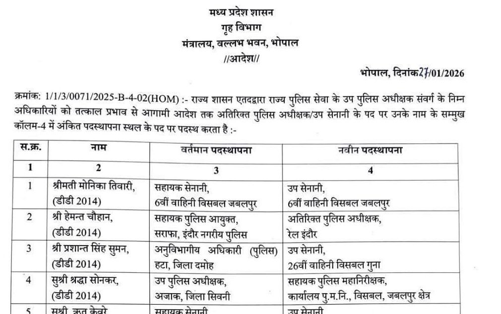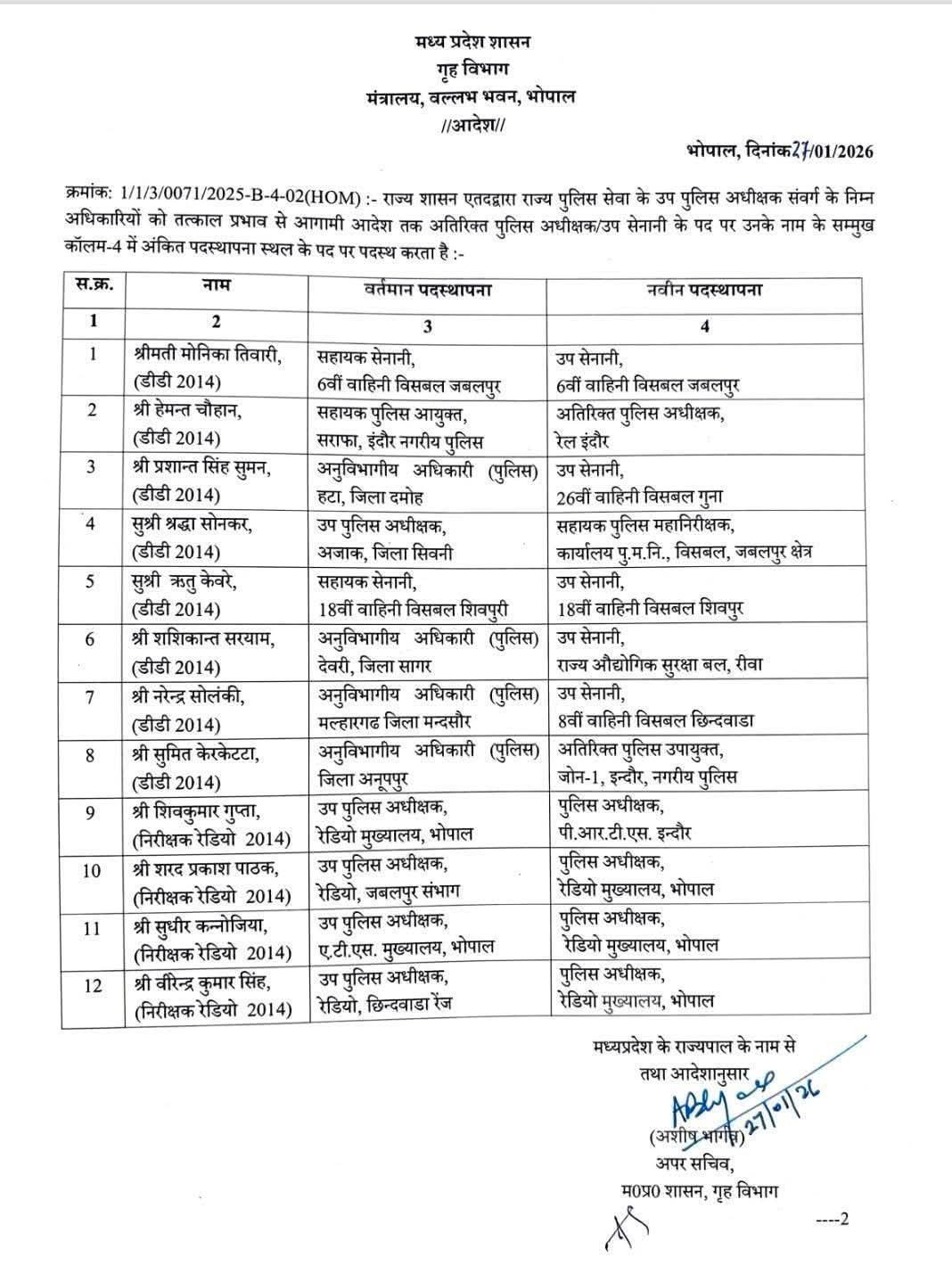 Bhopal उप पुलिस अधीक्षको के तबादले scnnewsindia.com January 27, 2026 Scn News Indiaब्यूरो रिपोर्ट उप पुलिस अधीक्षक संवर्ग पदस्थापना आदेश।Post navigationPrevious: पुलिस अधीक्षक ने जिले के तीन थानों के प्रभार बदले Related News Bhopal मंत्रि-परिषद की बैठक – कई महत्वपूर्ण फैसले scnnewsindia.com January 27, 2026 Bhopal अवैध कॉलोनी बनाने वालों पर अब 1 करोड़ तक का जुर्माना और 10 साल की जेल scnnewsindia.com January 27, 2026 Bhopal भोपाल एम्स की लिफ्ट में चैन स्नैचिंग की घटना – CCTV में कैद वीडियो वायरल scnnewsindia.com January 27, 2026