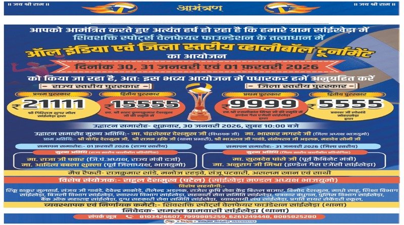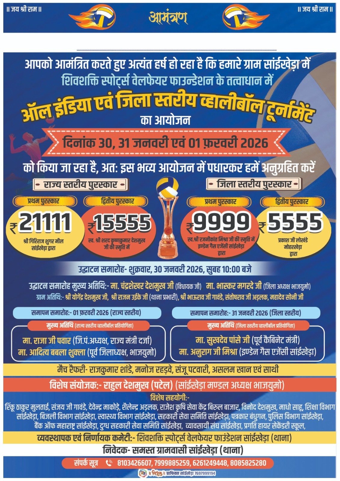 सांईखेड़ा:- शिवशक्ति स्पोर्ट्स वेलफेयर फाउन्डेशन के तत्वाधान में 30 जनवरी से 01 फरवरी तक तीन दिवसीय जिला व राज्य स्तरीय व्हालीबॉल प्रतियोगिता शुक्रवार को थाना ग्राउंड पर शुरू हो रही है प्रतियोगिता का उद्घाटन मुख्य अतिथि क्षेत्रीय विधायक माननीय चन्द्रशेखर देशमुख, भाजपा युवा मोर्चा के जिला अध्यक्ष भास्कर मगरदे, ग्राम के पटेल योगेन्द्र देशमुख, थाना प्रभारी राजन उईके, भाऊराव गांवड़े, संतोष अड़लक , महादेव सोनी के द्वारा किया जाएगा 01 फरवरी को राज्य स्तरीय प्रतियोगिता के समापन पर प्रथम पुरस्कार 21111 रूपये श्री गिरिराज शुगर मिल सांईखेड़ा द्वारा द्वितीय पुरस्कार 15555 रूपये स्वर्गीय शरद कुमार देशमुख की स्मृति में दिया जाएगा प्रतियोगिता में मुख्य अतिथि के तौर पर राजा पवार जिला पंचायत अध्यक्ष राज्य मंत्री दर्जा , आदित्य बबला शुक्ला पूर्व जिला अध्यक्ष भाजपा युवा मोर्चा शामिल होंगे एवं 31 जनवरी को जिला स्तरीय प्रतियोगिता के समापन पर प्रथम पुरस्कार 9999 रूपये स्वर्गीय श्री रजनीकांत मिश्रा की स्मृति में इण्डेन गैस एजेंसी सांईखेड़ा द्वारा द्वितीय पुरस्कार 5555 प्रकाश लोखंडे मोहरखेड़ा द्वारा दिया जाएगा इस प्रतियोगिता में मुख्य अतिथि माननीय सुखदेव पांसे पूर्व विधायक कैबिनेट मंत्री, माननीय अनुराग मिश्रा इण्डेन गैस एजेंसी सांईखेड़ा शामिल रहेंगे प्रतियोगिता में मैच रैफरी राजकुमार शांडे, मनोज रहड़वे, संजू पटवारी, असलम खान एवं साथी रहेंगे विशेष संयोजक राहुल देशमुख पटेल सांईखेड़ा मंडल अध्यक्ष भाजपा युवा मोर्चा विशेष सहयोगी रिंकू ठाकुर मुलताई, संजय गांवड़े, देवेन्द्र माकोड़े, शैलेन्द्र अड़लक, राजेश कृषि सेवा केन्द्र बिरूर बाजार, विनोद देशमुख, माधो साहू, शिक्षा विभाग, बिजली विभाग, स्वास्थ्य विभाग, सहकारी सेवा समिति, पत्रकार बंधु, पुलिस विभाग, बैंक ऑफ महाराष्ट्र दुग्ध सहकारी सेवा समिति, व्यवसायी संघ, प्रगति हायर सेकेंडरी स्कूल सांईखेड़ा शिवशक्ति स्पोर्ट्स वेलफेयर फाउन्डेशन एवं समस्त ग्रामवासी सांईखेड़ा के सहयोग से प्रतियोगिता सम्पन्न होने जा रही है।