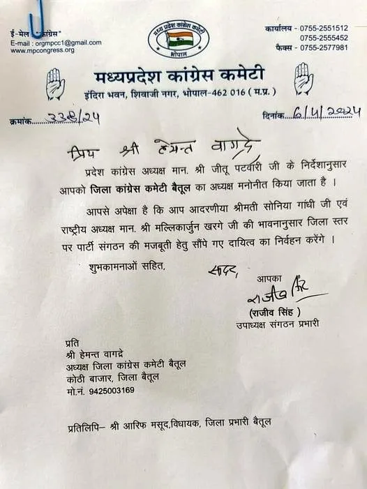 हेमंत वागद्रे को कांग्रेस ने ग्रामीण जिलाध्यक्ष से सम्पूर्ण जिले का अध्यक्ष नियुक्त कर दिया है। बता दे की गुड्डू शर्मा के इस्तीफे के बाद पद खाली था बैतूल जिला कांग्रेस शहर अध्यक्ष गुड्डू शर्मा के इस्तीफा देकर भाजपा जॉइन कर लेने के बाद कांग्रेस ने ग्रामीण जिलाध्यक्ष हेमंत वागद्रे को फुल प्लेस अध्यक्ष के तौर पर नियुक्त कर दिया है।