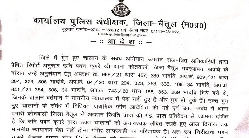 जारी आदेश में कहा गया है की जिले में गुम हुए चालान के संबंध अभियान उपरांत राजपत्रित अधिकारियों द्वारा प्रेषित रिपोर्ट अनुसार उनि पवन कुमरे की थाना कोतवाली जिला बैतूल पदस्थापना अवधि के दौरान उन्हें अनुसंधान हेतु अपराध क्रं. 968 / 21 धारा 457, 380 भादवि, अप.क्रं. 909/21 धारा 294, 323, 506 भादवि अप.क्रं. 84 / 20 धारा 294, 323, 353, 336, 109, 34 भादवि, अप.क्रं. 641/21 384, 506, 34 भादवि अप.क्रं. 743/ 20 धारा 188, 353, 269 भादवि दिये गये थे, जिनके चालान वर्तमान में माननीय न्यायालय में पेश नहीं हुए है और गुम हो चुके हैं। उक्त गुम हुए चालानों के संबंध में विधिवत प्राथमिक जांच आदेशित की गई एवं उक्त संबंध में थाना प्रभारी कोतवाली जिला बैतूल से अद्यतन स्थिति प्राप्त की गई, प्राप्त प्रतिवेदन से प्रथमतः दर्शित है कि उनि पवन कुमरे द्वारा उक्त चालानों को अनावश्यक लंबित रखते हुए आज दिनांक तक माननीय न्यायालय पेश नहीं होना गंभीर लापरवाही का परिचायक है। अतः उप निरीक्षक पवन कुमरे तैनात थाना गंज जिला बैतूल को तत्काल प्रभाव से निलंबित किया जाकर रक्षित केन्द्र जिला बैतूल संबद्ध किया जाता है।