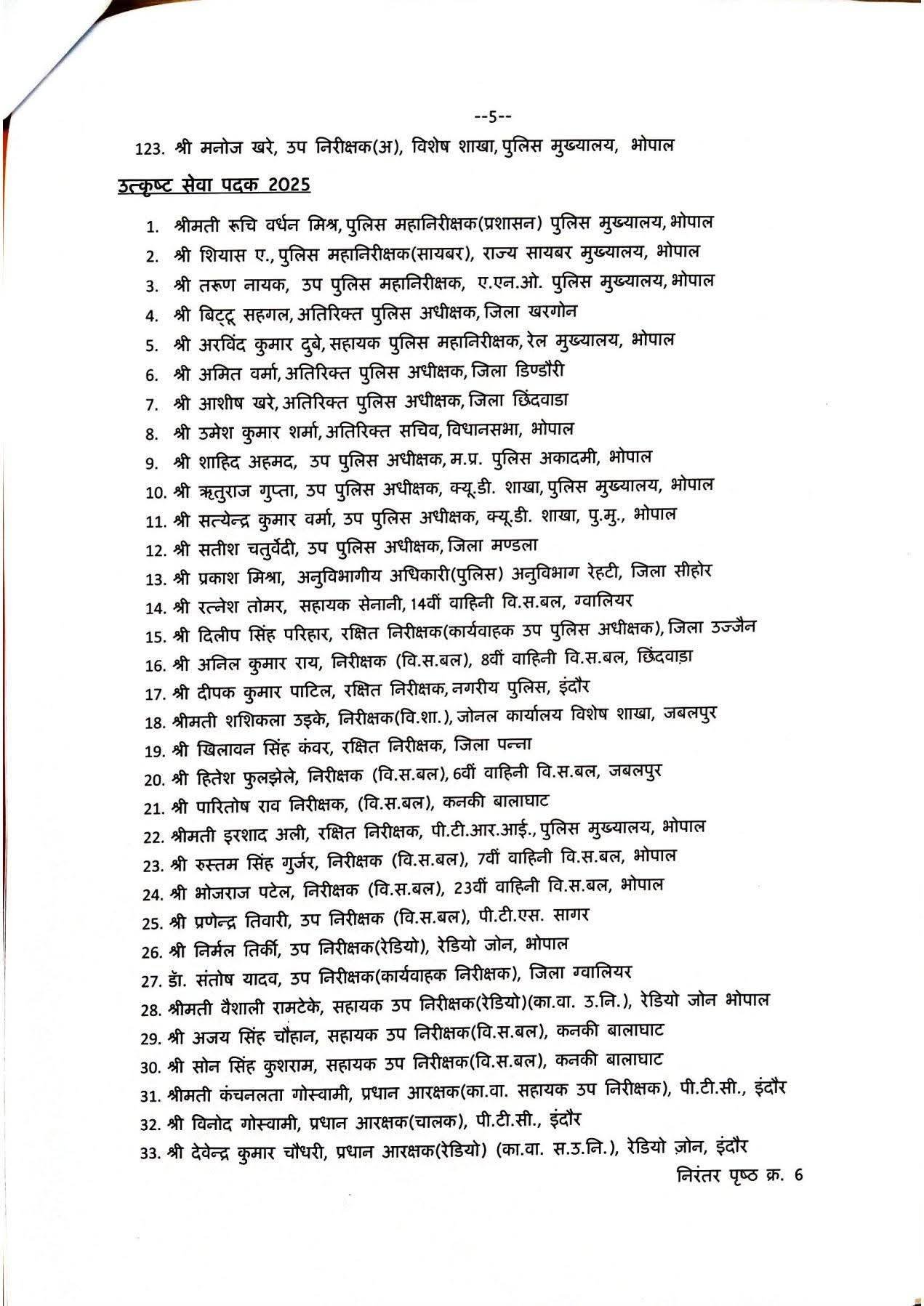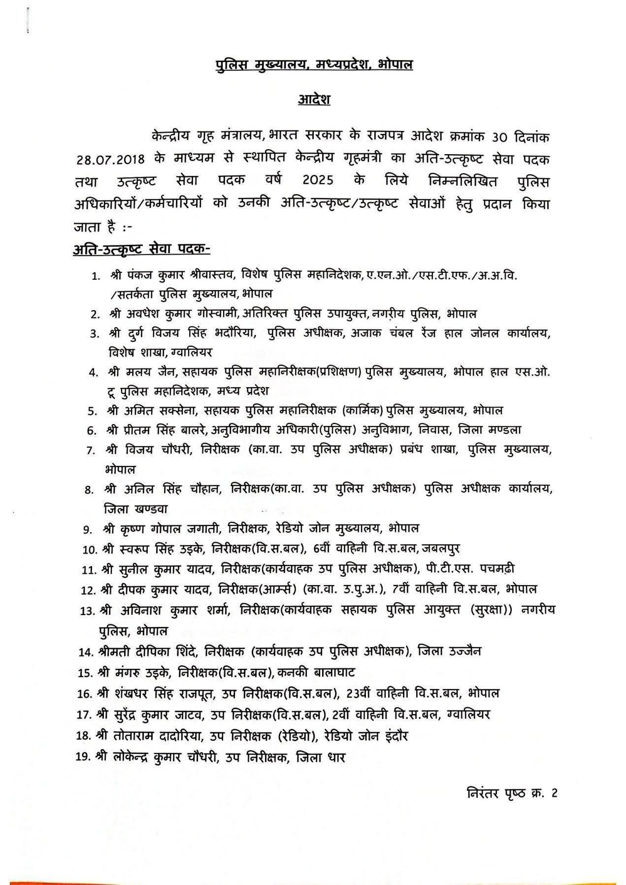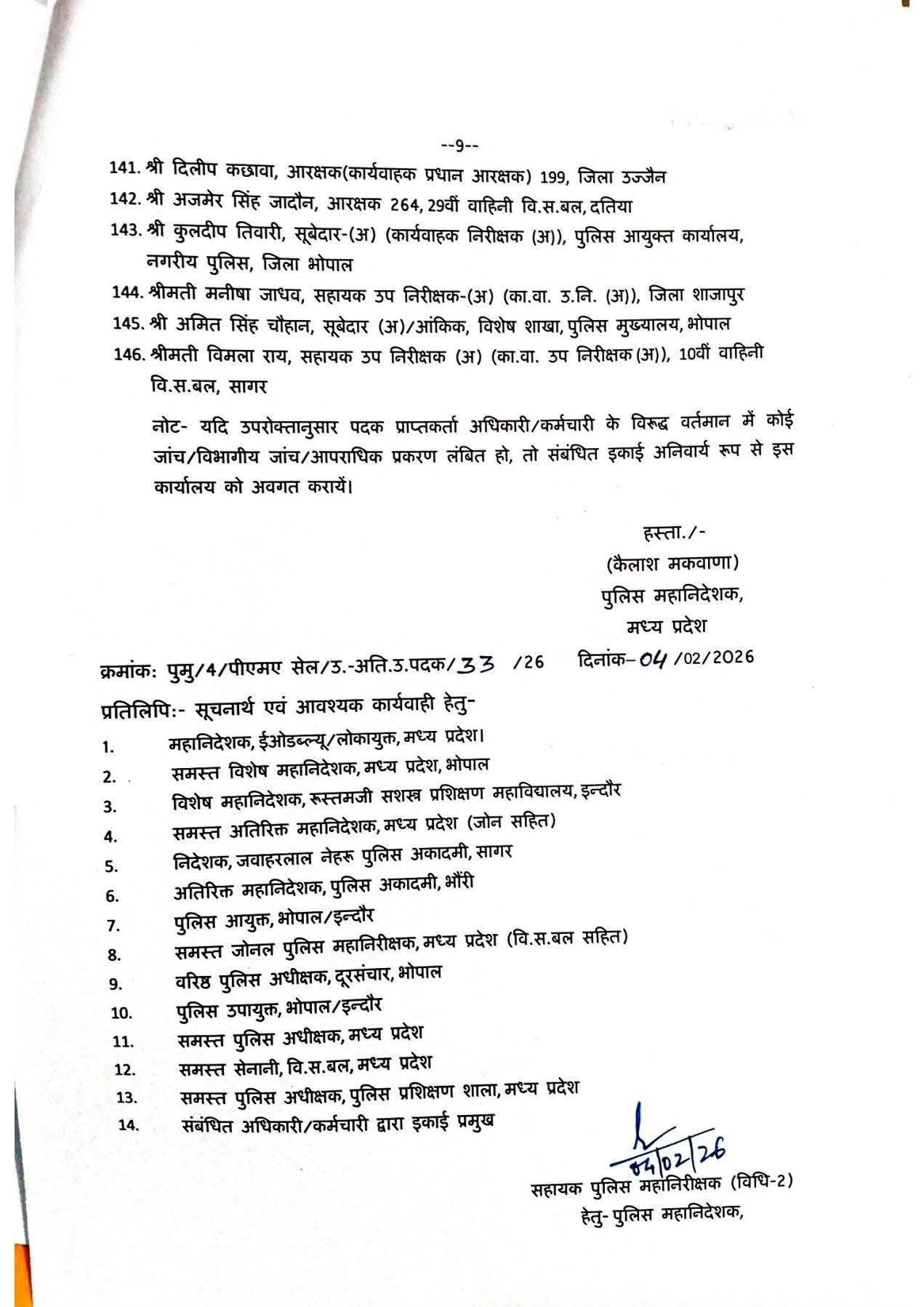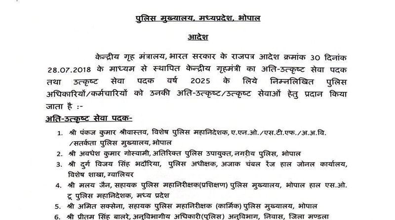 Bhopal मध्य प्रदेश पुलिस के 238 पुलिस अधिकारी कर्मचारी अति उत्कृष्ट और उत्कृष्ट सेवा पदक से किया गया सम्मानित scnnewsindia.com February 5, 2026 1 minute readScn News Indiaब्यूरो रिपोर्ट मध्य प्रदेश पुलिस के 238 पुलिस अधिकारियों और कर्मचारियों को अति उत्कृष्ट और उत्कृष्ट सेवा पदक से किया गया सम्मानित। Post navigationPrevious: सभी पात्र हितग्राहियों को मिले वन अधिकार पट्टों का लाभ : संभागायुक्त श्री तिवारीNext: राह चलती लडकियो पर कटर से हमला करने वाला सीरियल कटर बाज पुलिस की गिरफ्त में,धुनाई के साथ निकला जुलुस Related News Bhopal राह चलती लडकियो पर कटर से हमला करने वाला सीरियल कटर बाज पुलिस की गिरफ्त में,धुनाई के साथ निकला जुलुस scnnewsindia.com February 5, 2026 Bhopal राजधानी में शुरू हुआ अवैध कालोनियों में अतिक्रमण हटाने का काम scnnewsindia.com February 5, 2026 Bhopal बिजली मीटर से छेड़छाड़ करने पर धारा 136 में होगी कार्यवाही scnnewsindia.com February 4, 2026