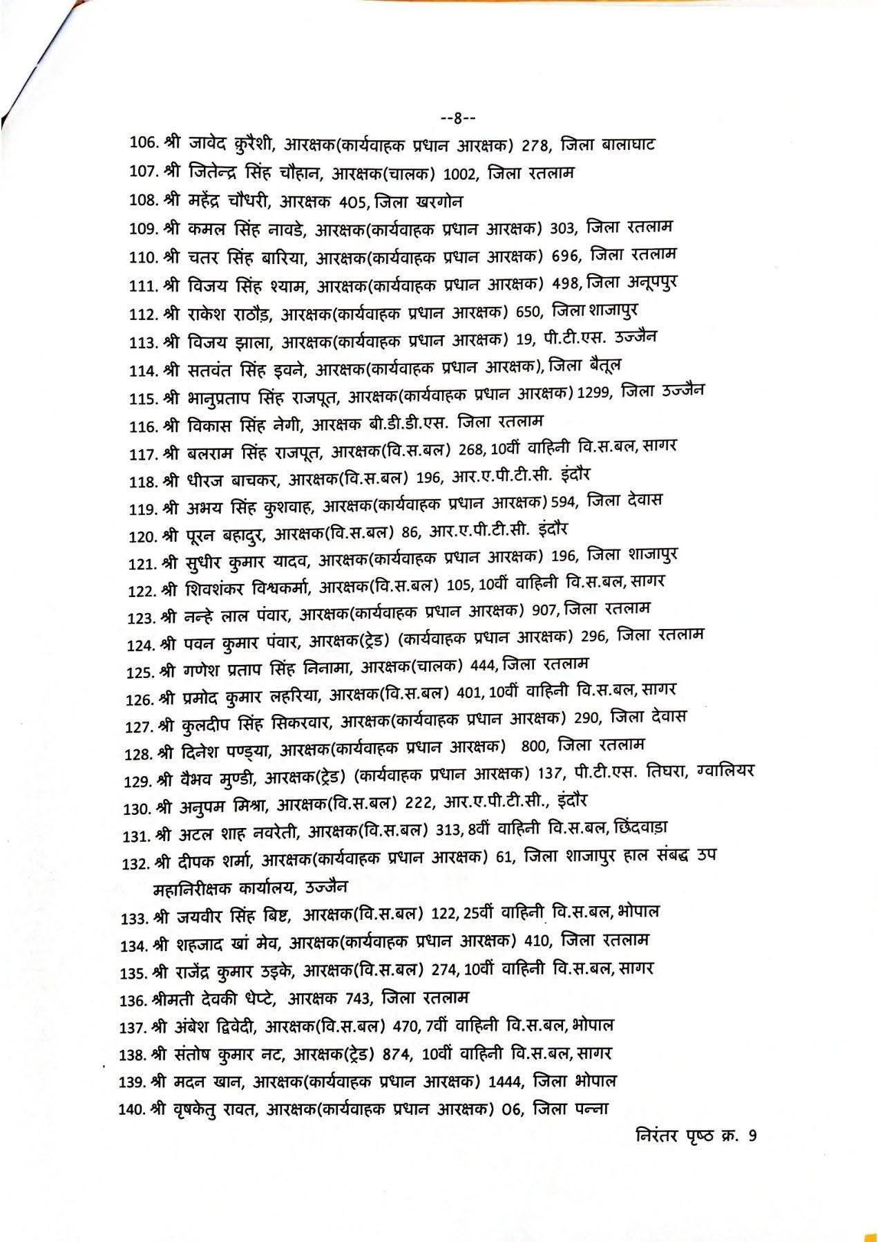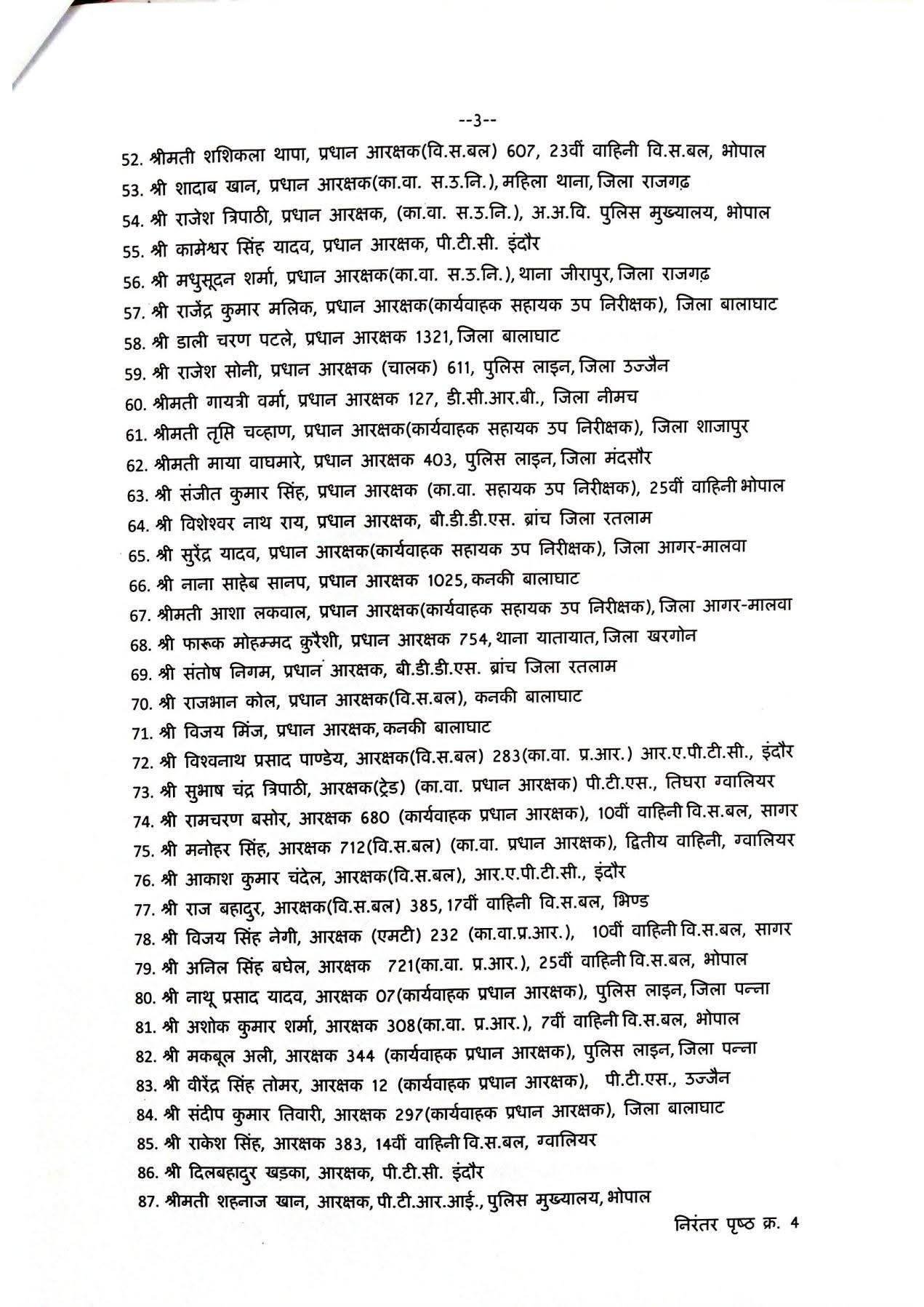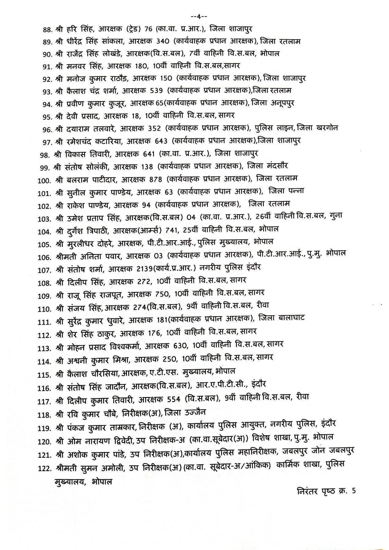 Bhopal मध्य प्रदेश पुलिस के 238 पुलिस अधिकारी कर्मचारी अति उत्कृष्ट और उत्कृष्ट सेवा पदक से किया गया सम्मानित scnnewsindia.com February 5, 2026 1 minute readScn News Indiaब्यूरो रिपोर्ट मध्य प्रदेश पुलिस के 238 पुलिस अधिकारियों और कर्मचारियों को अति उत्कृष्ट और उत्कृष्ट सेवा पदक से किया गया सम्मानित। Post navigationPrevious: सभी पात्र हितग्राहियों को मिले वन अधिकार पट्टों का लाभ : संभागायुक्त श्री तिवारीNext: राह चलती लडकियो पर कटर से हमला करने वाला सीरियल कटर बाज पुलिस की गिरफ्त में,धुनाई के साथ निकला जुलुस Related News Bhopal राह चलती लडकियो पर कटर से हमला करने वाला सीरियल कटर बाज पुलिस की गिरफ्त में,धुनाई के साथ निकला जुलुस scnnewsindia.com February 5, 2026 Bhopal राजधानी में शुरू हुआ अवैध कालोनियों में अतिक्रमण हटाने का काम scnnewsindia.com February 5, 2026 Bhopal बिजली मीटर से छेड़छाड़ करने पर धारा 136 में होगी कार्यवाही scnnewsindia.com February 4, 2026