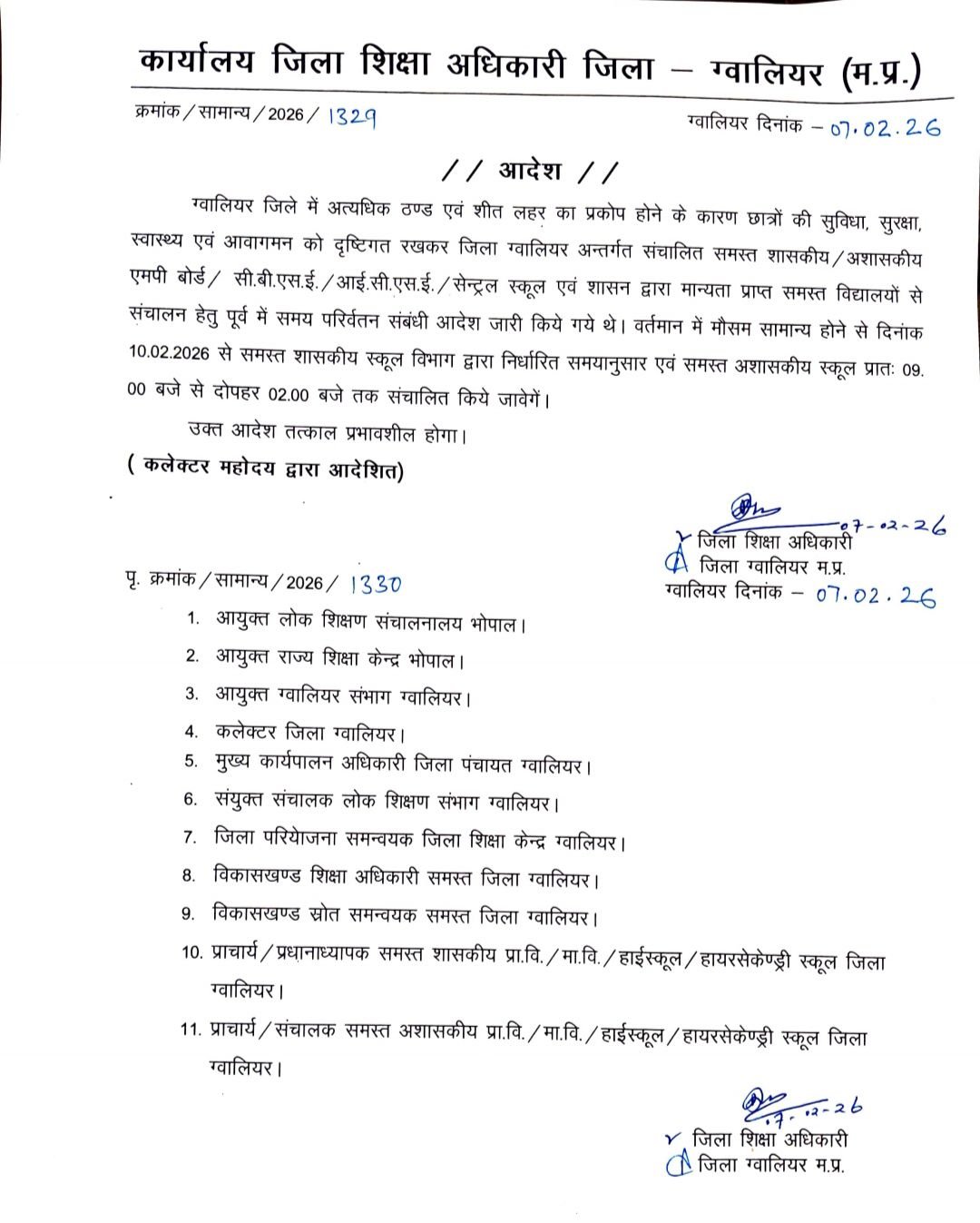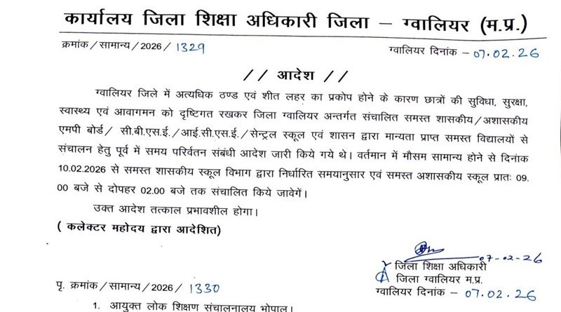 ग्वालियर जिले में फरवरी माह में मौसम सामान्य होने से 10 फरवरी से स्कूलों के समय में परिवर्तन किया गया है। कलेक्टर श्रीमती रूचिका चौहान के निर्देश पर यह आदेश जिला शिक्षा अधिकारी श्री हरिओम चतुर्वेदी ने जारी किया है। इस आदेश के अनुसार स्कूलों में 10 फरवरी से कक्षाएं सुबह 9 बजे से दोपहर 2 बजे तक संचालित होंगी। यह आदेश ग्वालियर जिले में संचालित समस्त शासकीय, अशासकीय, एमपी बोर्ड सी.बी.एस.ई, आई.सी.एस. ई. एवं शासन द्वारा मान्यता प्राप्त विद्यालयों में लागू होगा।