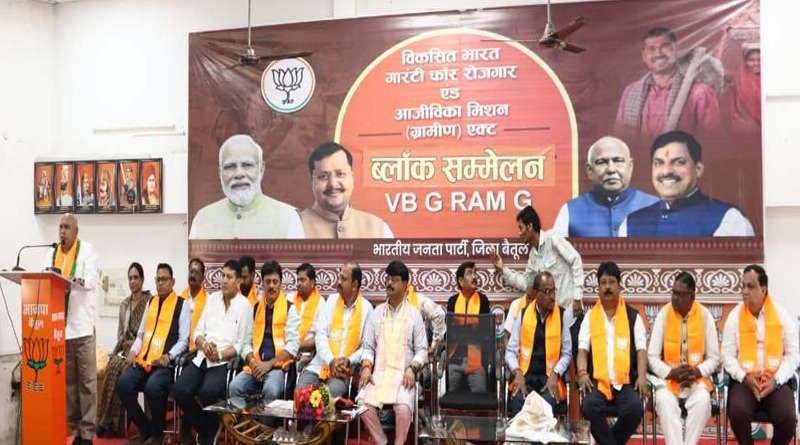 बैतूल। भारतीय जनता पार्टी जिला कार्यालय विजय भवन में आयोजित वीबी जी राम जी अभियान के तहत बैतूल विकासखंड का सम्मेलन संम्पन हुआ। सम्मेलन को संबोधित करते हुए भाजपा प्रदेश अध्यक्ष हेमंत खंडेलवाल ने कहा कि वीबी जी राम जी नई साईकल की तरह है जिसे कोई परिवार पुरानी और खस्ता हाल हो चुकी साईकल से बदलता है। विकसित भारत गारंटी फॉर रोजगार आजीविका मिशन ग्रामीण 2025 के तहत अब गांव की योजना और निर्माण गांव के हिसाब से तय होगें। 100 दिन की जगह 125 दिन का रोजगार मिलेगा। आजीविका में वृद्वि होगी, गांव के हिसाब से काम होने से किसान और श्रमिक दोनो को लाभ होगा।
