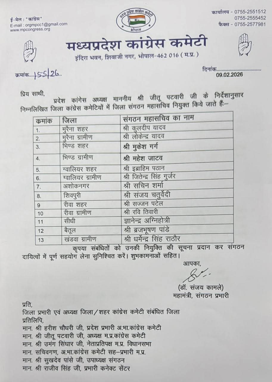Bhopal जिला कांग्रेस कमेटियों में जिला संगठन महासचिव नियुक्त scnnewsindia.com February 10, 2026 Scn News India ब्यूरो रिपोर्ट प्रदेश कांगेस अध्यक्ष जीतू पटवारी के निर्देशानुसार निम्नलिखित जिला कांग्रेस कमेटियों में जिला संगठन महासचिव नियुक्त किये गए हैं। Post navigation Previous: गुदगांव (चिल्कापुर) के प्रसिद्ध रामेश्वरम शिवधाम मंदीर में भव्य शिवपुराण एवं रुद्र महायज्ञ सप्ताह का आयोजन कल सेNext: कलेक्टर श्री सूर्यवंशी ने बोर्ड परीक्षाओं को लेकर जारी किए प्रतिबंधात्मक आदेश Related News Bhopal कक्षा 9वीं व 11वीं की पूरक परीक्षा के स्थान पर द्वितीय परीक्षा होगी आयोजित scnnewsindia.com February 10, 2026 Bhopal कांग्रेस ने की 58 ब्लॉक के अध्यक्षों की घोषणा scnnewsindia.com February 10, 2026 Bhopal फायर सेफ्टी से संबंधित कार्य को प्राथमिकता से करें पूर्ण: उप मुख्यमंत्री श्री शुक्ल scnnewsindia.com February 9, 2026