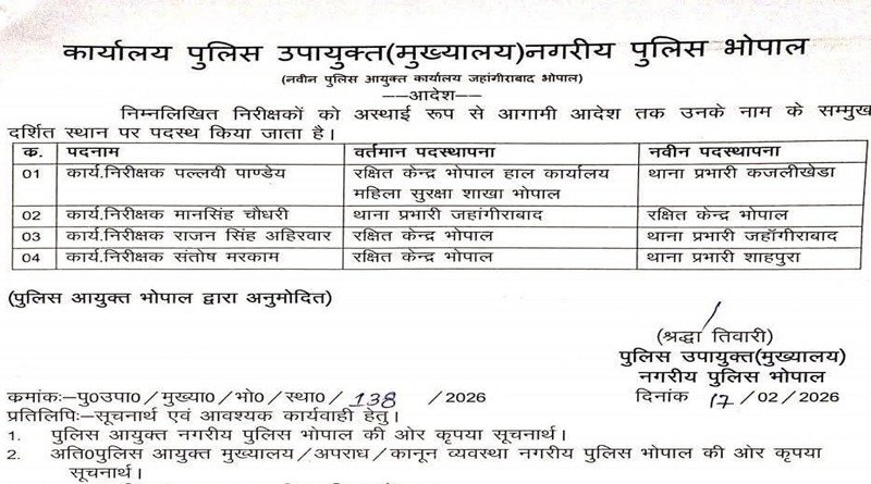 scn news india थाना प्रभारियों में फेरबदल scnnewsindia.com February 18, 2026 Scn News Indiaब्यूरो रिपोर्ट राजधानी भोपाल में हुआ आज थाना प्रभारियों में फेरबदलPost navigationPrevious: शिव मंदिर प्रांगण में शिव पार्वती जी का विवाहNext: बड़ा प्रशासनिक फेर बदल 119 आरआई बने नायब तहसीलदार – सूची Related News scn news india वन अमले के तीन लोगो पर चलाई गोली, डिप्टी रेंजर सहित महिला कर्मचारी की पीठ में लगी गोली scnnewsindia.com February 17, 2026 scn news india *मकान मालिकों के लिए सबसे सुरक्षित विकल्प: लाइव एंड लाइसेंस एग्रीमेंट क्यों है किराएदारी समझौते से बेहतर?* scnnewsindia.com February 17, 2026 scn news india अधिवक्ता संजय कुमार सक्सेना की गोली मार निर्मम हत्या के 05 आरोपी गिरफ्तार scnnewsindia.com February 17, 2026