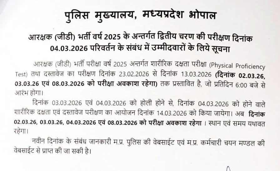दिनांक 03.03.2026 एवं 04.03.2026 को होली होने से, दिनांक 04.03.2026 को होने वाले शारीरिक दक्षता एवं दस्तावेज परीक्षण का आयोजन दिनांक 14.03.2026 को किया जायेगा। अब दिनांक 02.03.26, 03.03.26, 04.03.2026 एवं 08.03.2026 को परीक्षा अवकाश रहेगा। स्थान एवं समय यथावत रहेगा।