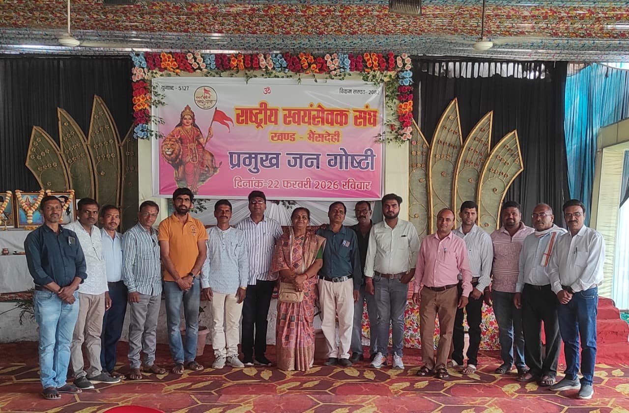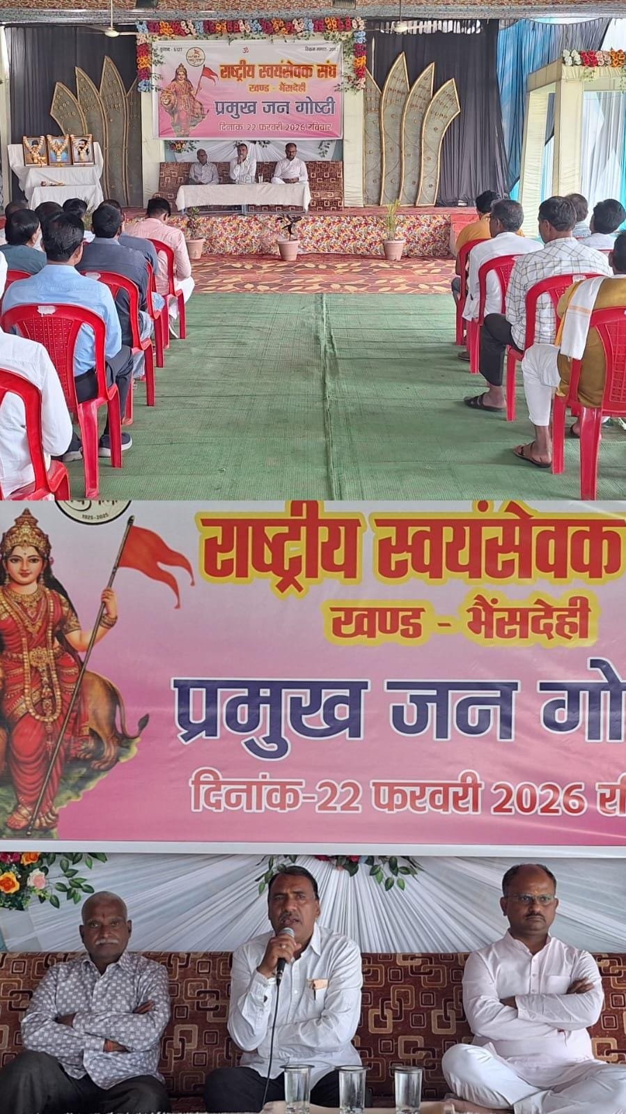 भैसदेही:- राष्ट्रीय स्वयंसेवक संघ (RSS) के शताब्दी वर्ष के निमित्त चल रहे कार्यक्रमो की श्रृंखला में आज भैंसदेही खंड केन्द्र पर चंदन कि बगिया लॉन में “प्रमुख जन गोष्ठी” का आयोजन किया गया जिसमें भैंसदेही खंड अंतर्गत आने वाले 21 मंडलो से एक सैकड़ा से भी अधिक सामाजिक, धार्मिक एवं विविध संगठन के महिला- पुरुषो ने भाग लिया।