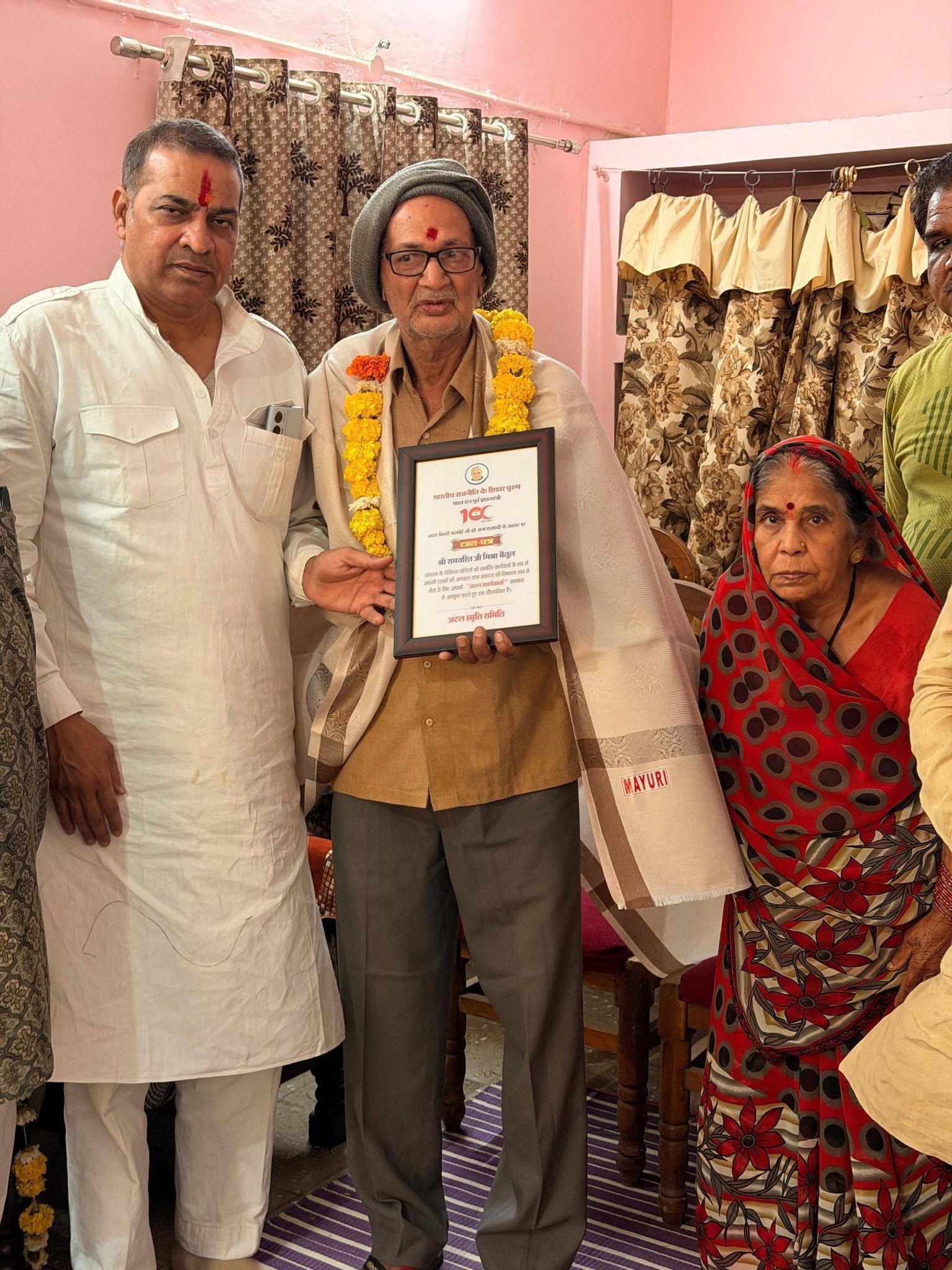भारतीय जनता युवा मोर्चा के पूर्व प्रदेश अध्यक्ष अटल स्मृति समिति के राष्ट्रीय संयोजक *धीरज पटेरिया* पूरे मप्र में लगभग पच्चीस हजार किलोमीटर की यात्रा कर हर जिले में जनसंघी कार्यकर्ताओं को घर पंहुचकर रजत पत्र शाल श्रीफल भेंट कर सम्मानित कर रहे इसी क्रम में आज बैतूल जिले में पहुंचे सबसे पहले *श्री शिवचरण अग्रवाल जी मुलताई ,श्री रामचरित मिश्रा जी बैतूल,श्री राजा ठाकुर जी बैतूल,श्री रमेश मिश्रा जी बैतूल,श्री छोटेलाल राठौर की खारी,श्री इक्कम सिंह जी मंडई,श्री महेश महतो जी जुआड़ी,श्री रामदीन जी उईके जिलेरी श्री केशव प्रसाद मिश्रा जी भौंरा,श्री रामकुमार जी वर्मा बैतूल,श्री सुखदेव यादव जी तारा* को सम्मानित किया।