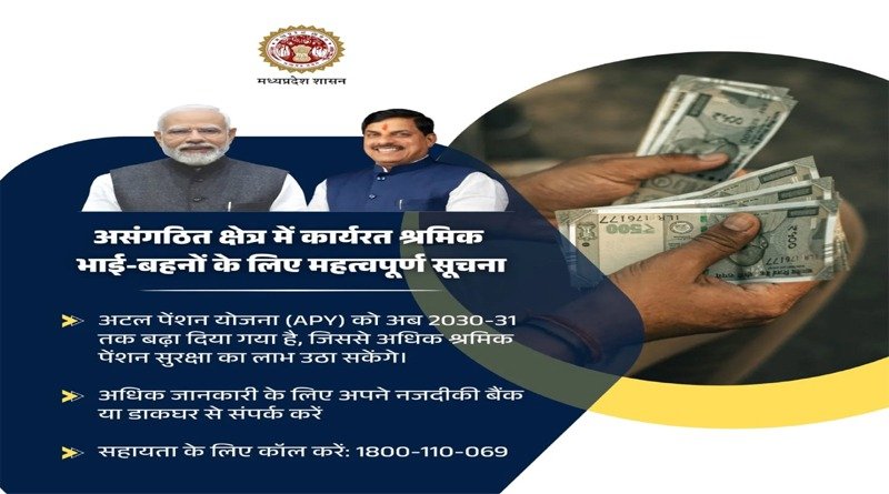 मध्यप्रदेश सरकार द्वारा असंगठित क्षेत्र में कार्यरत श्रमिक भाई-बहनों के लिए महत्वपूर्ण सूचना जारी की है। अटल पेंशन योजना (APY) को अब 2030-31 तक बढ़ा दिया गया है, जिससे अधिक श्रमिक पेंशन सुरक्षा का लाभ उठा सकेंगे।