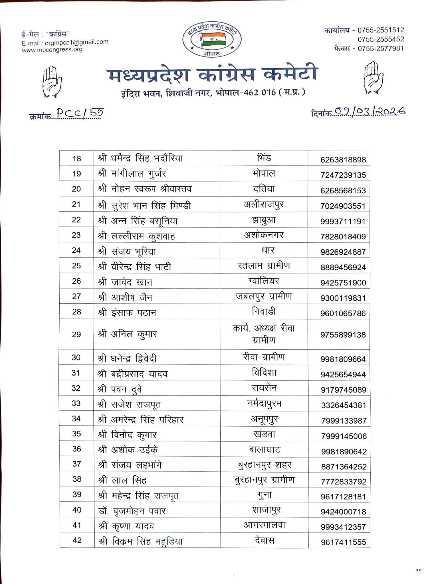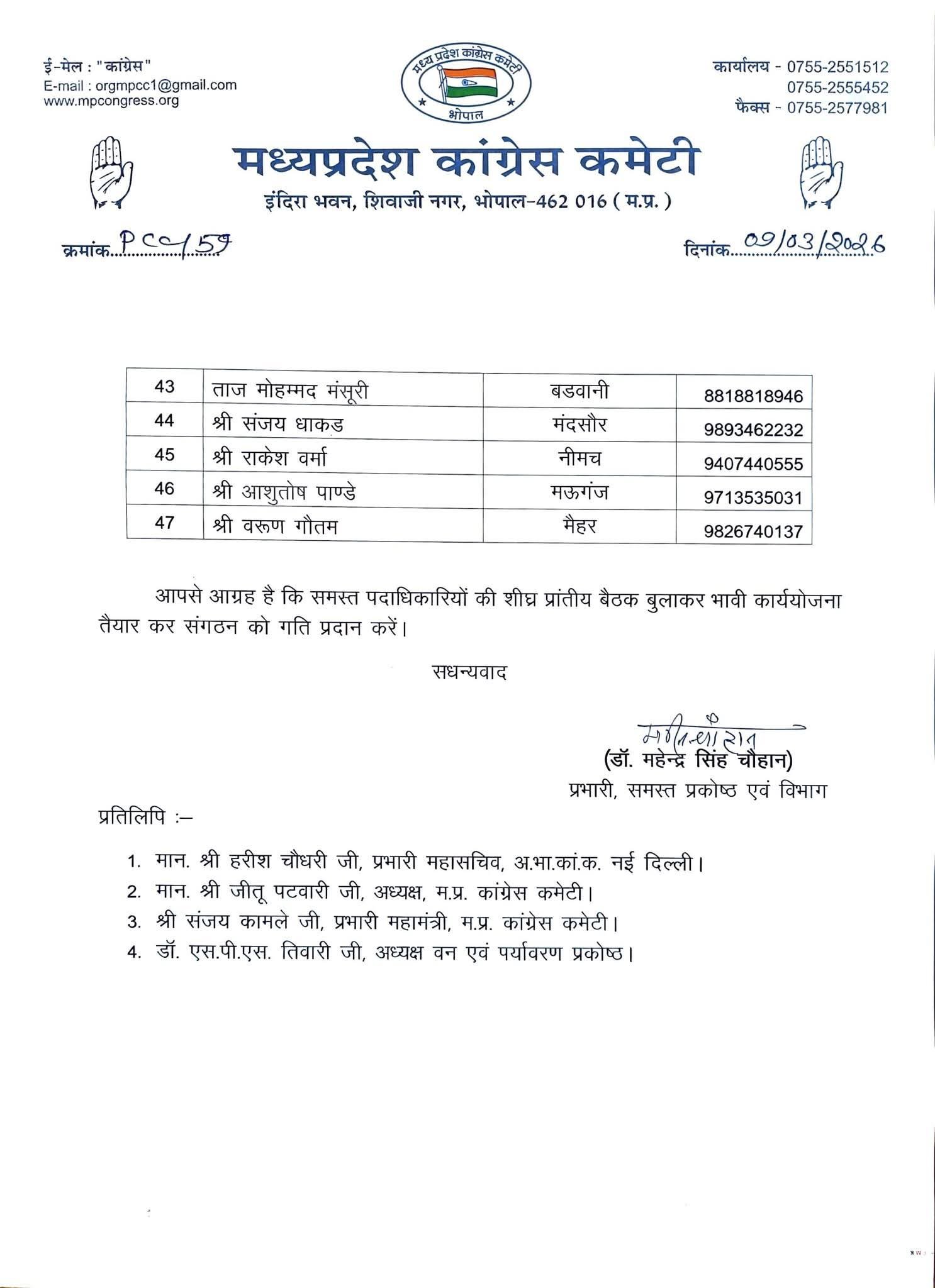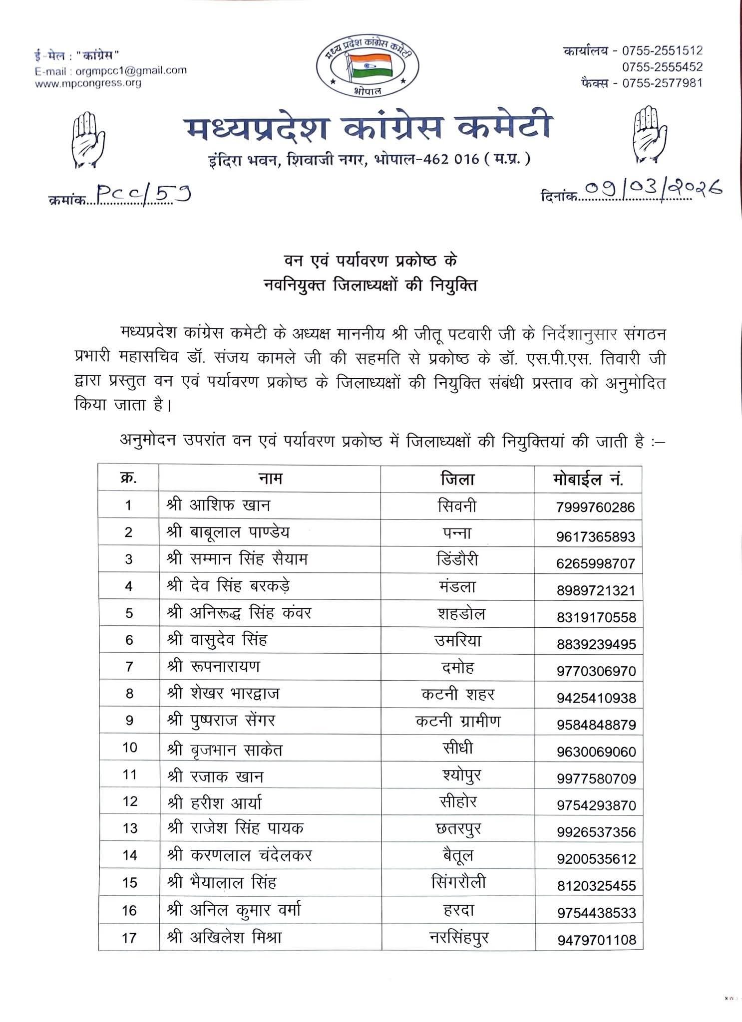 Bhopal वन एवं पर्यावरण प्रकोष्ठ कांग्रेस के जिला अध्यक्षों की नियुक्ति scnnewsindia.com March 9, 2026 Scn News Indiaब्यूरो रिपोर्टप्रदेश कांग्रेस अध्यक्ष श्री जीतू पटवारी जी के निर्देशानुसार वन एवं पर्यावरण प्रकोष्ठ के जिला अध्यक्षों की नियुक्ति की गई है। Post navigationPrevious: सुप्रीम कोर्ट की सख्ती: दिल्ली के 51 निजी अस्पतालों को गरीबों के मुफ्त इलाज न देने पर अवमानना नोटिस Related News Bhopal पंडित दीनदयाल उपाध्याय प्रशिक्षण महाअभियान कार्यशाला संपन्न scnnewsindia.com March 7, 2026 Bhopal गैस की बढ़ी कीमतों के विरुद्ध कांग्रेस ने किया जोरदार प्रदर्शन scnnewsindia.com March 7, 2026 Bhopal मध्यप्रदेश साइबर फॉरेंसिक प्रयोगशाला में e-Forensic 2.0 का किया शुभारंभ scnnewsindia.com March 7, 2026